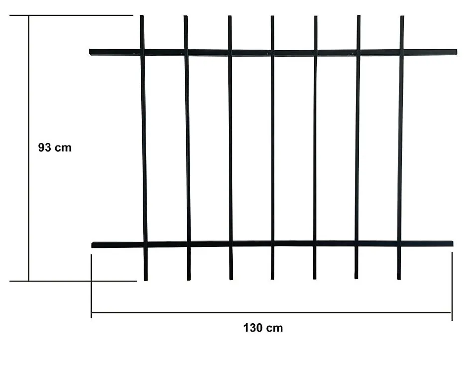 •Grille en Acier prépeinte d’une peinture d’apprêt noire. Il vous appartient de la peindre de deux couches de finition•Dimension de la grille Hauteur : 93 cm, Largeur : 130 cm. 7 barreaux en carré plein 12 x 12 mm. 14 cm entre barreau.•Pose facile par scellement entre tableaux avec une prise de 5 cm de chaque côté (4 trous suffisent à la fixation).•Pour une installation optimale les dimensions doivent être mesurées de mur à mur crépis fini•Les rayures, les éclats superficiels ne peuvent être considérés comme vices de fabrication.•Fabrication Française.•Superbe grille qui empêchera toute personne non désirée d’entrer, ou de sortir, de vos fenêtres ouvertes.
