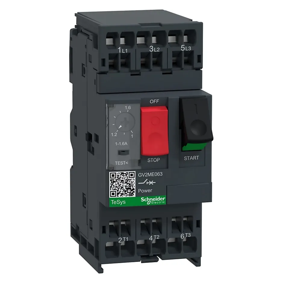 Disjoncteur magnéto-thermique GV2ME 1 à 1,6A – TeSys Schneider GV2ME063Une gamme phare de chez Schneider Electric, anciennement Télémécanique, la gamme GV2ME est reconnue pour sa qualité made in France.Destinée à la protection de vos moteurs électriques triphasés et monophasés, ce disjoncteur est équipé d’un déclencheur magnéto-thermique réglable de 1 à 1,6A.Ce disjoncteur tripolaire TeSys GV2 possède un système de connexion automatique, il se monte sur rail DIN. Il peut être câblé dans une armoire électrique ou un coffret électrique étanche Schneider GV2MC. La gamme TeSys comporte de nombreux accessoires compatibles avec ce disjoncteur.Ce disjoncteur magnétothermique peut protéger un moteur triphasé de 0,37 kW en 380V et un moteur monophasé 0,18 kW en 220V.Les spécificités du disjoncteur moteur GV2ME063Fabriqué en FranceDéclencheur Déclencheur magnéto-thermiquePlage du réglage thermique 1 à 1,6ARaccordement automatique