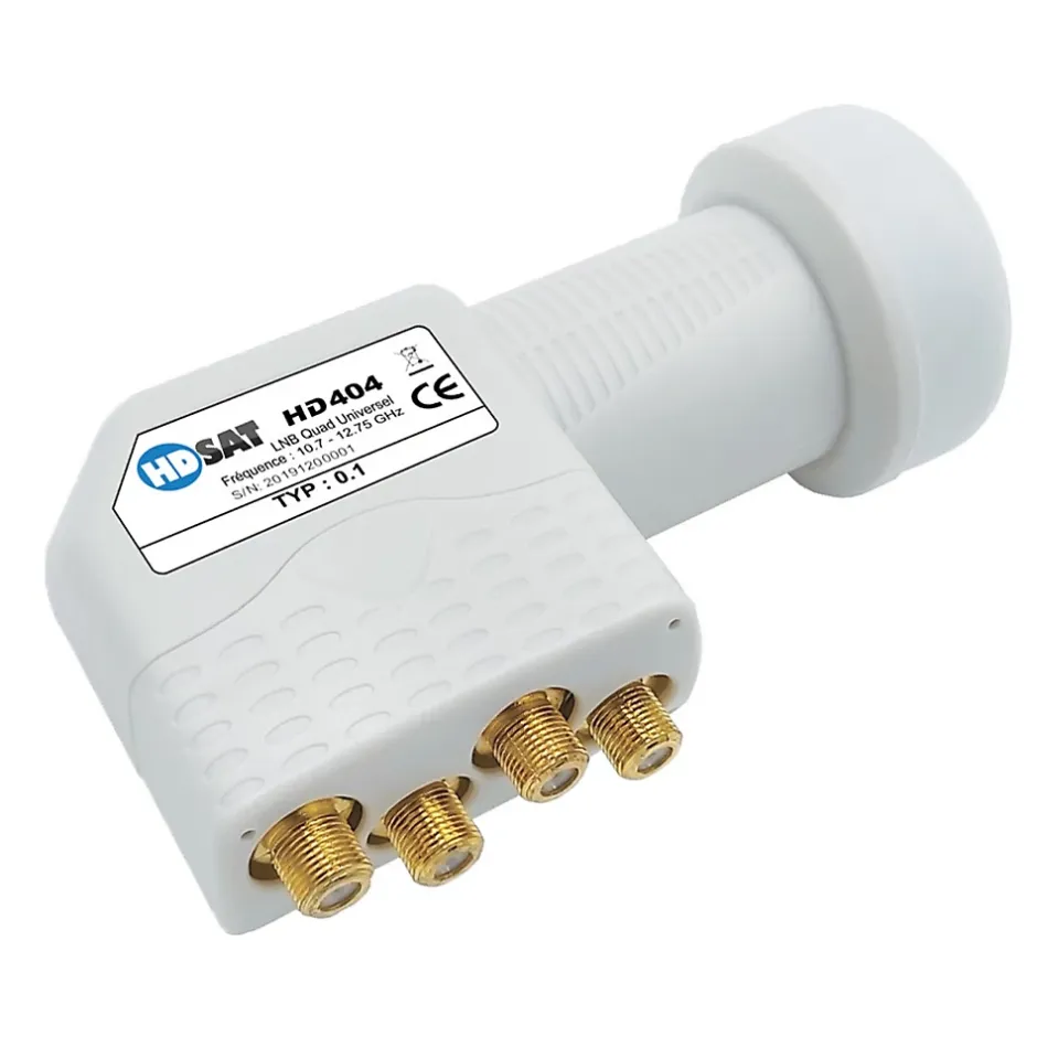 HDSAT HD404 LNB Quad Universel Full HD 4KMarque: HDSATModèle: HD404Type: LNB Quad 4 sorties, permet d’alimenter jusqu’à 4 récepteurs satellite.Fréquence: 10.7 – 12.75 GHzTYP: 0,1dBGain Max: 65dBCache de protection pour les Fiches FConnectiques GoldGarantie 2 ans