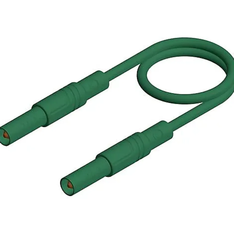 Cordon de mesure de sécurité vert 1 m, fiches banane mâle 4 mm des deux côtés, câble silicone ultra‑flexible à double isolation, ressort de contact en cuivre‑béryllium nickelé, indicateur couleur intégré pour détection des dommages, protection contre l’écrasement, certification CE.