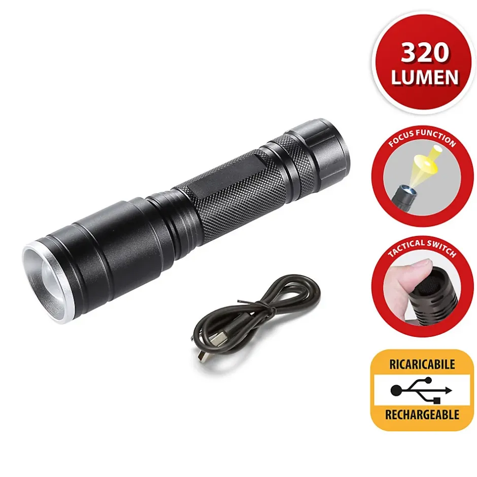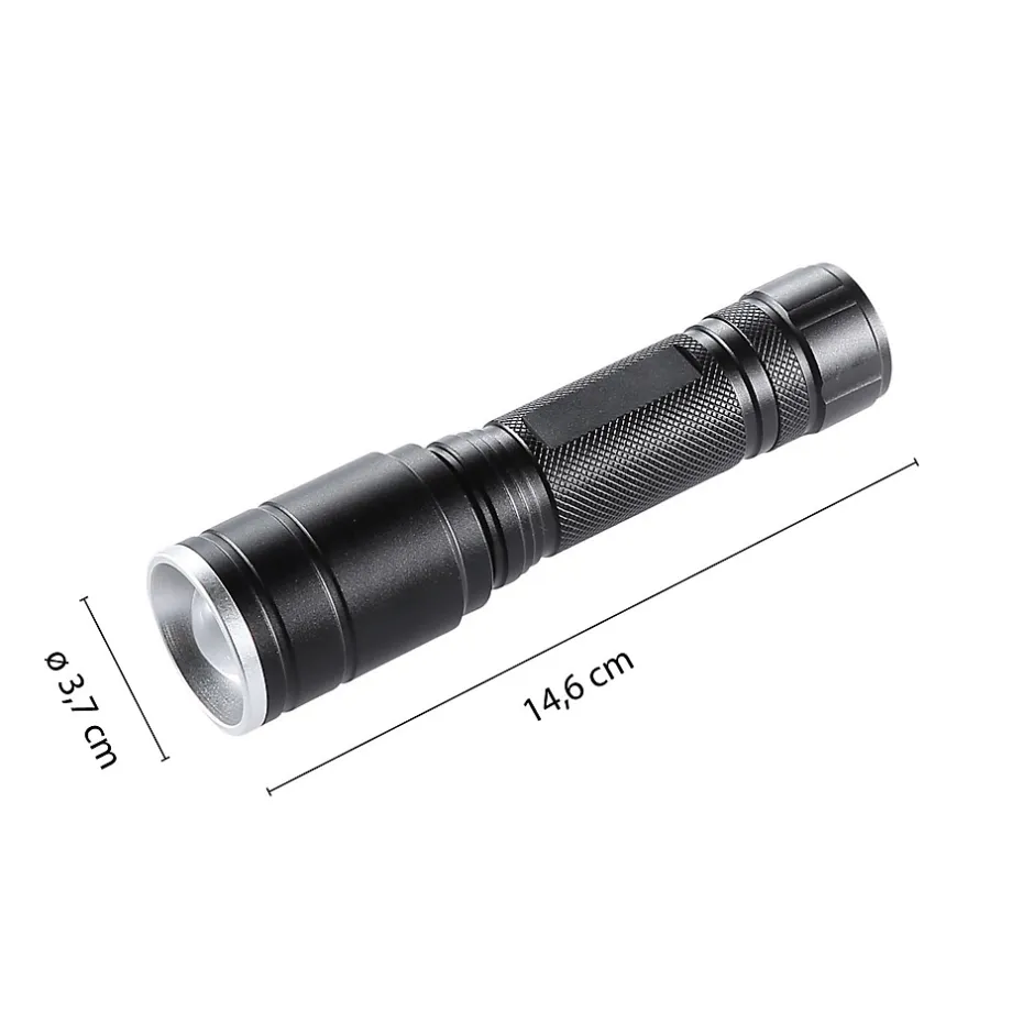 Une torche LED rechargeable à usage professionnel avec de très hautes performances ; contient : 1x lampe de poche LED rechargeable 5w avec fonction zoom, 1x batterie rechargeable (batterie Li-ion 18650 3.7V 1200 mAh), 1x câble micro USB de 50cm. La lampe de poche monte une LED haute puissance de 320 lumens 5 W ; portée : 100 mètres ; avec fonction zoom pour une vision éloignée ou rapprochée ; autonomie : jusqu’à 10 heures (50%). Conception compacte, légère et durable (alliage d’aluminium), IP44 (pour une utilisation en extérieur), interrupteur tactique en caoutchouc. Avec powerbank intégré : vous pouvez recharger votre téléphone ! Zoom : de 12° jusqu’à 75° ; 100 % lumière / 50 % lumière / stroboscope. Parfait pour le chantier de construction; randonnée, camping, voiture et usage domestique en général.