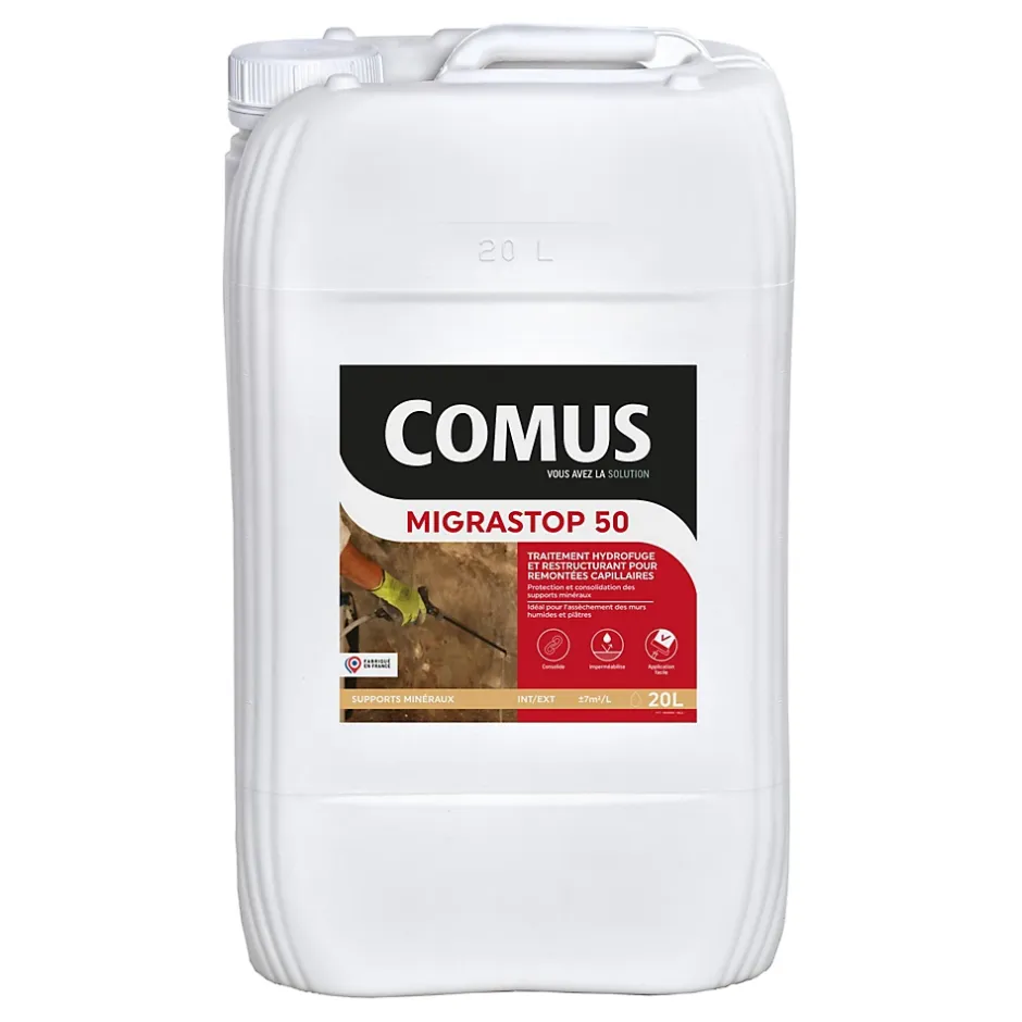 PROPRIÉTÉS ET AVANTAGESFabrication françaiseMIGRASTOP 50 Traitement Hydrofuge pour remontées capillaires, murs humides, pierres calcaires, plâtres. Prêt à l’emploi, il permet l’imperméabilisation et la consolidation des supports minéraux poreux. MIGRASTOP 50 pénètre le support et agit en profondeur selon un procédé de minéralisation, sans former de film en surface. Il forme une barrière protectrice dans le support pour empêcher les remontées d’eau tout en laissant respirer les matériaux. Il est destiné au traitement des remontées capillaires et des bas de murs humides, et à la protection des plâtres et des façades en pierres calcaires humides. Intérieur – Extérieur.SUPPORTSMurs en pierre, PlâtresTEINTE ET ASPECTAspect : Brut minéralColoris : IncoloreCONDITIONNEMENT5L et 20LRENDEMENT5 à 10m² / LOUTILSPulvérisateur, brosse, raclette »Produit dangereux. Respecter les précautions d’emploi »