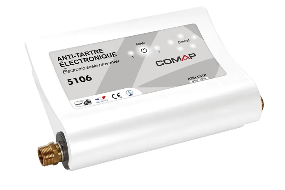 Il élimine le tartre existant en le désagrégeant progressivement,- il empêche la formation de dépôt de tartre,- il permet aux générateurs d’eau chaude de conserver leur rendement et leur efficacité,- l’eau ne subit aucun traitement chimique et conserve sa minéralité, elle reste potable, elle conserve sa richesse d’origine en carbonates de calcium et en sels minéraux nécessaires à la santé,- il est sans entretien et n’utilise aucun consommable,- installation facile sur canalisation neuve ou existante. Domaines d’application : – installation domestique eau froide,- boucle eau chaude sanitaire. Données techniques : – Pression de service : de 0 à 4 bars.- Débit max : 3000 l/h.- Fusible : 63 mA T.- Puissance électrique : 10 VA max.- Étanchéité : IP 31.- Température eau : 5 à 70 °C.- Raccordement sur réseau électrique monophasé 230 V~ 50/60 Hz + terre.- Protection pour les surtensions secteur.- Sélecteur de puissance de traitement antitartre : position 1 pour eau de TH position 2 pour eau de TH ge; 25 °F.- Dureté de l’eau à traiter jusqu’à 60 °F ou 34 °DH. Garantie 2 ans : contre vices de fabrication, hors pièces d’usure.
