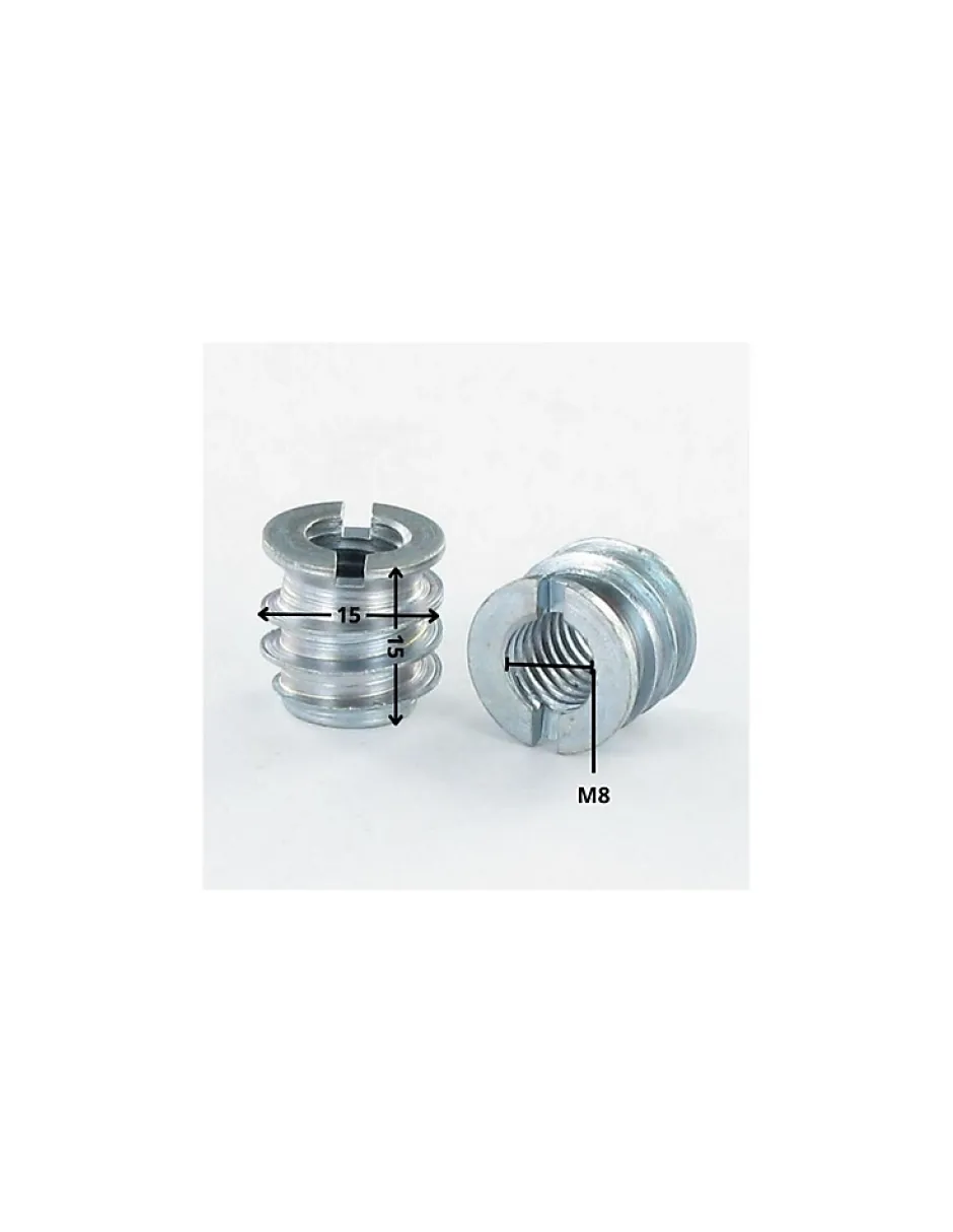 Insert fileté bois fendu M8 15X15 Acier zinguéDiametre = M8, Revetement De Surface = Zingue Blanc, Matiere = Acier, Pas = Pas standard de 125, Empreinte = Fendu, Famille De Produits = EcrouAutre références : 3617500616319 L000315 410083 L000315 1010A0068 3663072188228