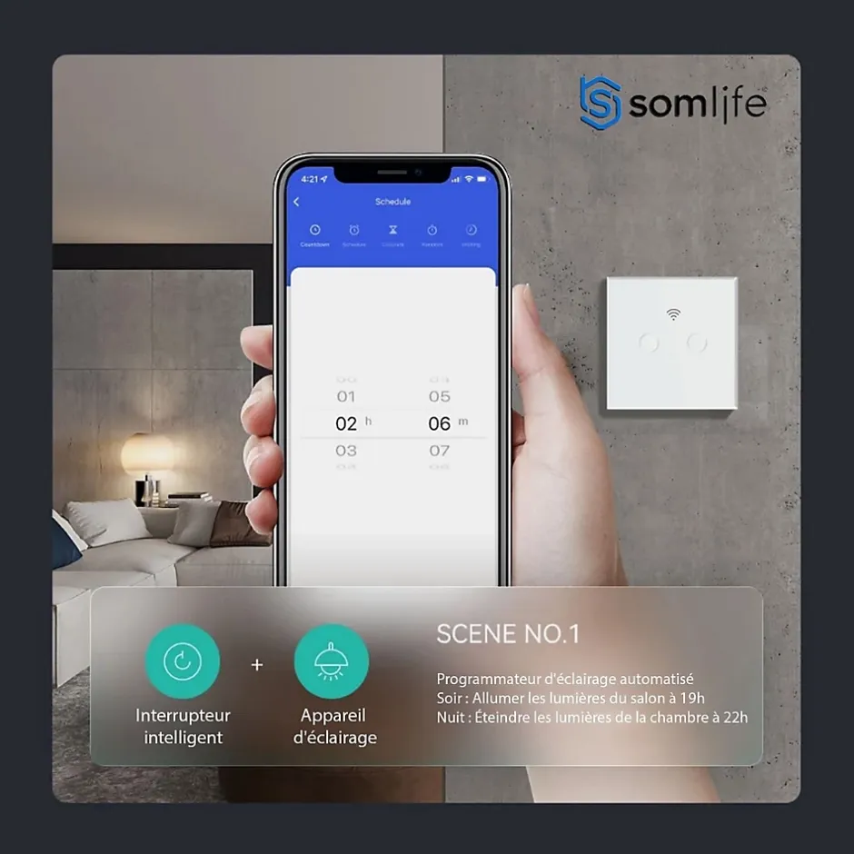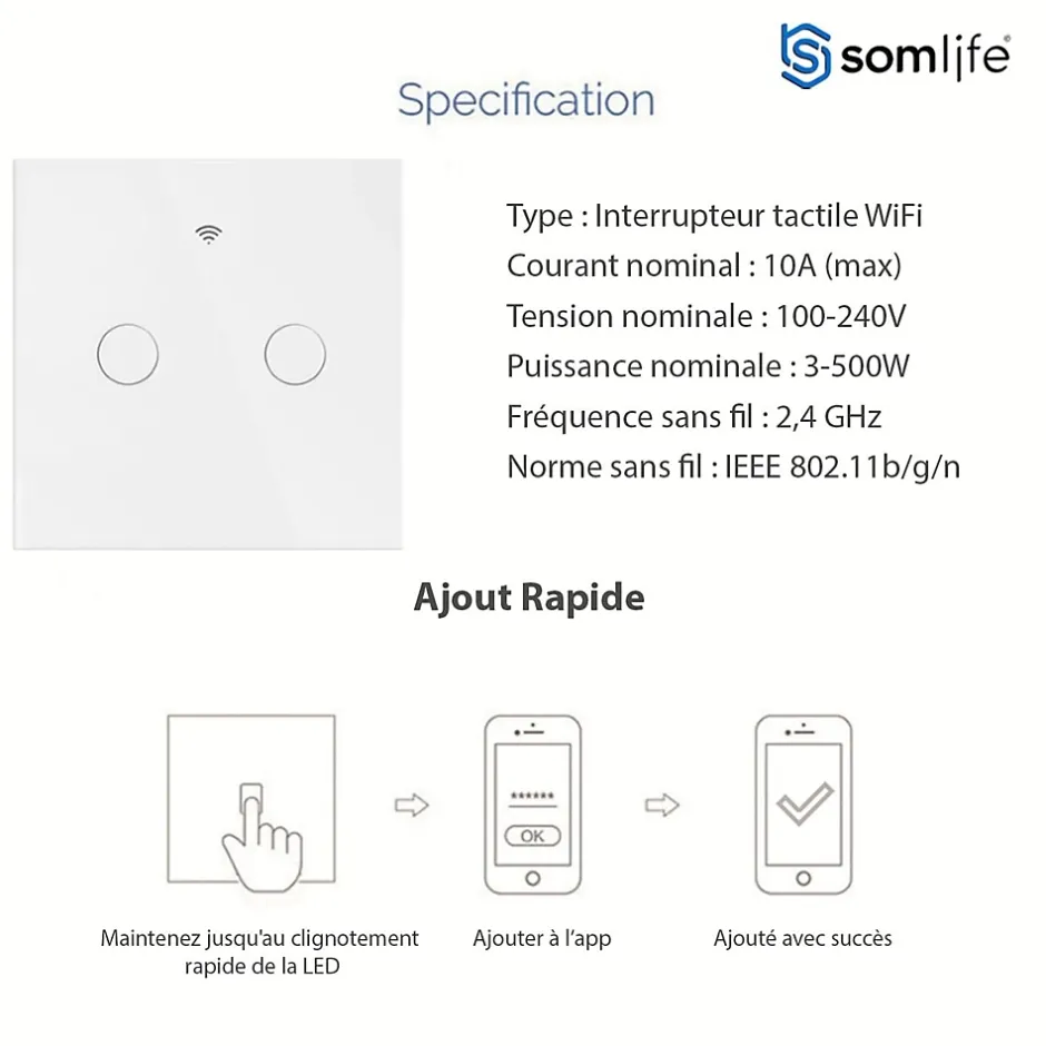Découvrez les Interrupteurs Tactiles SomLife, une solution innovante pour automatiser et contrôler facilement l’éclairage de votre domicile. Chaque Interrupteur 2 canaux Somlife Connecté WiFi offre une installation sans tracas et un contrôle intuitif grâce à son interface tactile capacitif. Conçu pour un montage encastré, il supporte une puissance de charge de 2 à 1000W par gang, idéal pour les applications domestiques standard.Avec la connectivité WiFi intégrée, vous pouvez jumeler rapidement ces interrupteurs avec les applications Tuya Smart ou Smart Life, vous permettant de gérer vos lumières de n’importe où, que vous soyez à la maison ou en déplacement. L’application vous offre la possibilité de surveiller et de contrôler l’état de vos éclairages, ainsi que de créer des programmes de minuterie ou de compte à rebours personnalisés pour une automatisation maximale.Compatible avec Alexa et Google Assistant, l’Intelligent Interrupteur Tactile vous permet de contrôler vos lumières simplement par la voix, ajoutant une commodité supplémentaire à votre quotidien. Créez des groupes d’interrupteurs pour un contrôle simultané et définissez des scènes personnalisées pour adapter votre éclairage à chaque moment de la journée.Les Interrupteurs Tactiles Somlife répondent aux normes universelles de l’UE et sont équipés pour une alimentation électrique de AC 100-240V. Chaque circuit supporte jusqu’à 10A avec une puissance maximale de 1000W, assurant une performance fiable et sécurisée. Fabriqués avec des matériaux de haute qualité comme le PC V0 ignifuge et le panneau en verre trempé, ces interrupteurs sont conçus pour durer.Explorez la gamme complète de produits connectés SomLife, parfaitement intégrés avec les applications Tuya et Smart Life, vous offrant ainsi une expérience complète de maison connectée. Transformez votre maison avec les Interrupteurs Tactiles SomLife et profitez d’une gestion intelligente de l’éclairage adaptée à vos be…