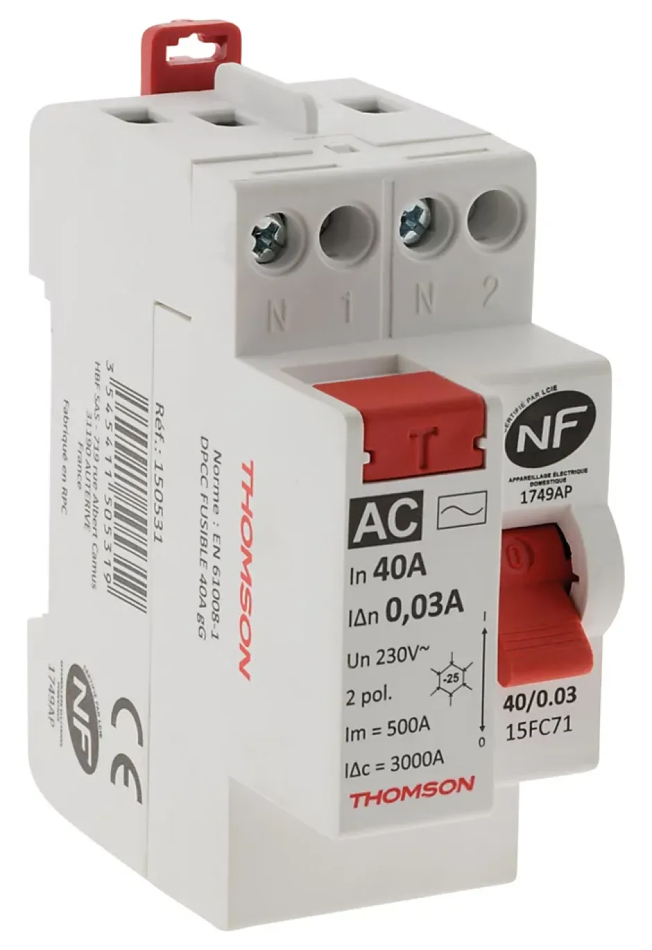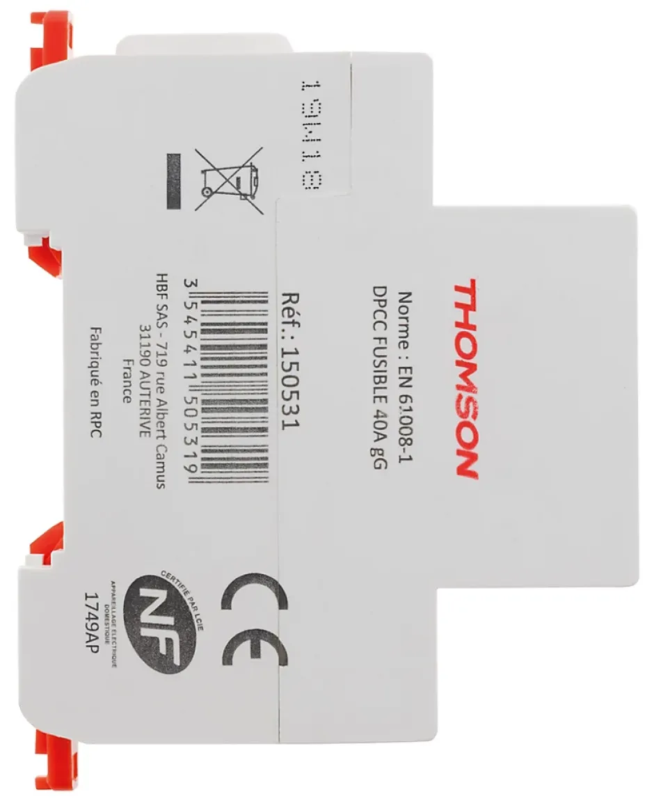 Caractéristiques de l’interrupteur différentiel à vis – 40A type AC NF – Thomson :Modèle : interrupteur différentiel à vis type ACTension assignée 230V/50HzTension de tenue au choc 4000VCourant résiduel assigné : 30mAPuissance : 40AArrivée et départ par le hautBranchements avec peignes standardsPeut être installé sur votre tableau électrique par serrage classique à visIndicateurs ON/OFF mécanique avec marquage sur la manetteLivré avec un porte étiquetteConforme aux normes NF EN 61008-1 et NF EN 61008-2-1A l’unité ou en lot de 3L’interrupteur différentiel à vis type AC est conçu pour protéger vos circuits électriques contre les fuites de courant Il possède une tension assignée de 230V/50Hz et une tension de tenue au choc de 4000V, assurant une protection optimale même dans des conditions extrêmes. Ce modèle détecte les courants résiduels à 30mA, garantissant une sécurité renforcée. Avec une puissance de 40A, il est idéal pour divers types de circuits.Il est conçu pour un branchement avec peignes standards et peut être installé facilement sur votre tableau électrique grâce à un système de serrage classique à vis. Les indicateurs ON/OFF mécaniques et le marquage sur la manette assurent une manipulation simple et rapide.Conforme aux normes NF EN 61008-1 et NF EN 61008-2-1, cet interrupteur est également livré avec un porte-étiquette pour une identification claire. Disponible à l’unité ou en lot de 3, il répond aux besoins de diverses installations.