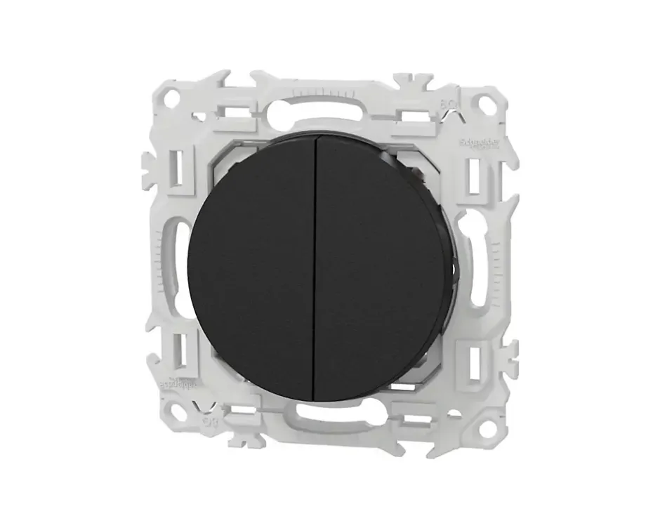 Double va-et-vient ou poussoir Odace noir onyx – Schneider Electric S940214Interrupteur double 10A convertible va-et-vient ou poussoir, idéal pour commander deux circuits distincts. Finition noir onyx mat, montage encastré affleurant et raccordement sur bornes automatiques pour un câblage rapide.