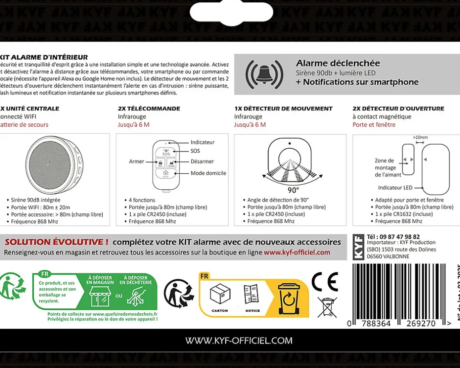 Protégez votre domicile en toute simplicitéLe KIT ALARME KYF-ALARM-009 est une solution de sécurité fiable, évolutive et facile à installer. Grâce à sa connectivité WiFi 2,4 GHz et sa technologie radio 868 MHz, il permet de protéger efficacement votre maison ou appartement contre les intrusions. Un système complet qui allie performance, simplicité d’utilisation et design discret.POINTS FORTS DU PRODUITConnectivité WiFi 2,4 GHz pour un contrôle à distance via smartphone- 9 zones de surveillance indépendantes- Sirène puissante intégrée de 90 dB + flash lumineux- Détection d’ouverture et de mouvement instantanée- Notifications d’alerte en temps réel- Installation rapide et sans fil- Système évolutif : ajoutez jusqu’à 30 accessoires (non inclus)- Contrôle multiple : via application mobile, télécommande ou bouton de sonnetteCONTENU DU KIT1x Unité centrale connectée WiFi avec batterie de secours intégrée6x Détecteurs d’ouverture (portes/fenêtres)3x Détecteur de mouvement infrarouge4x TélécommandesAPPLICATION TUYA SMART- Gérez votre alarme à distance :- Activation/désactivation- Historique des alertes- Notifications push en cas d’intrusion- Compatible iOS et AndroidIDÉAL POUR :- Appartement- Maisons individuelles- Locaux professionnelsLe KYF-ALARM-009 est le partenaire idéal pour une protection immédiate, sans abonnement et totalement personnalisable.SOLUTION ÉVOLUTIVEAjoutez jusqu’à 30 accessoires compatibles :