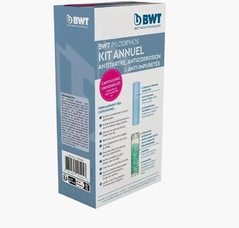 Le kit annuel antitartre Pilodiphos de BWT est conçu pour l’entretien des stations duplex Pilodiphos. Il contient deux cartouches complémentaires destinées à assurer une protection efficace contre le tartre, la corrosion et les impuretés présentes dans l’eau. La cartouche B.SECURE filtre les particules fines jusqu’à 25 microns telles que les boues, le sable ou la rouille. Elle contribue à préserver vos installations contre le grippage et la corrosion, tout en bénéficiant d’un manchon traité pour limiter le développement bactérien. La seconde cartouche, SILICO, est composée de cristaux de silicophosphate. Elle agit directement sur les phénomènes d’entartrage et de corrosion, prolongeant ainsi la durée de vie de vos appareils et canalisations. Ce kit est compatible avec tous les filtres standards de 10 pouces, dont les modèles BWT Pilodiphos et Pilodiphos PAP. Il est recommandé de remplacer les cartouches tous les 12 mois pour garantir un fonctionnement optimal de votre système de traitement de l’eau.