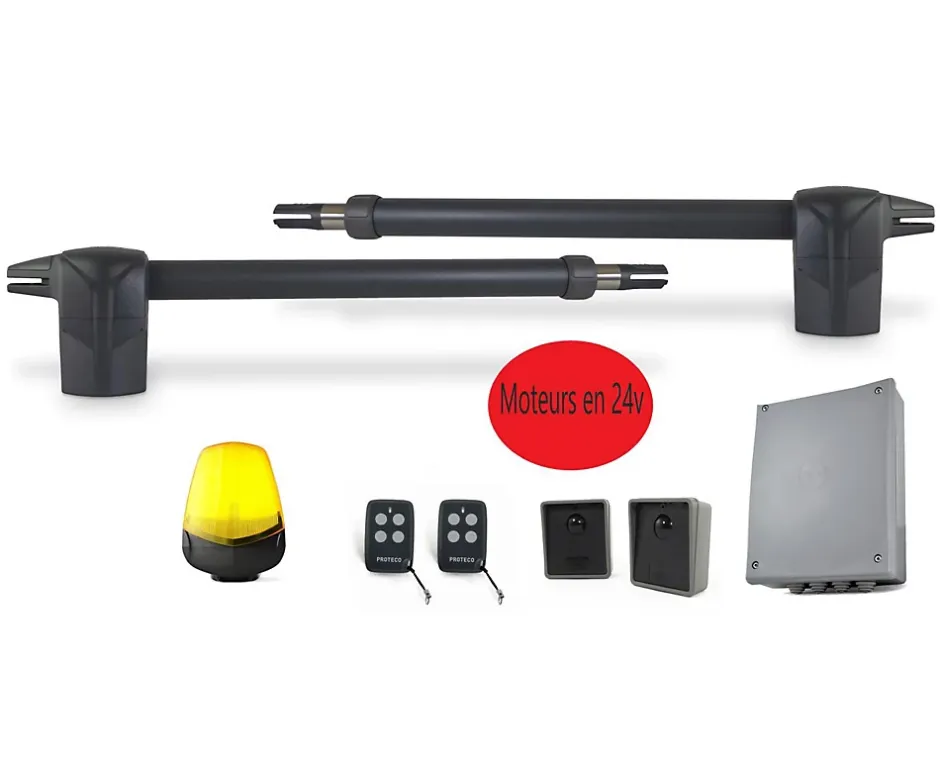 Le confort pratique à la portée de tous.Les fonctions de la centrale de commande : Ralentissements en fin de course – Ouverture piéton.Protection de la fermeture par réglage de la force et des photocellules, possibilité de commande par interphone, portier vidéo,clavier à code, ou bouton poussoir.Les télécommandes ont 4 boutons. Cela permet de commander 4 fonctions – (Ex: ouverture totale -ouverture pièton- ouverture porte de garage- commande d’éclairage).Le contacteur à clé ( en option ) est une commande filaire qui permet de commander l’ouverture comme le ferait un interrupteur.Les photocellules sont des élements de protection qui empêchent la refermeture si quelque chose ou quelqu’un est dans le passage.Le clignotant prévient du mouvement du portail. Il permet d’attirer l’attention et de savoir que l’ordre de la télécommande à bien été reçu. Les moteurs sont en 24 Volts ce qui permet d’avoir des batteries de secours ou /et un panneau solaire .Les accessoires – clignotant – cellules- sont en 24 v. Angles d’ouvertures 90 (110 sous certaines conditions et selon site). Le 4 de Aster 4 signifie 400mm de course utile, déport maximum 20 cm de l’arrête du pilier à l’emplacement des gonds. (l’Aster 4 est l’équivalent de l’ancien Aster 2) Le kit est livré avec.2 moteurs course 400 mm en 24v1 centrale de commande avec recepteur integré et son transformateur2 télécommandes (ANGIE)1 clignotant 24v 1 jeu de cellules (PRF34I)2 clés de dévérouillage moteurs de secours ( ref SCH02)Accessoires de fixation (ref SAAS14B)Notice.Made in CEE. + 2 batteries 12v 1.2A + raccordements Possibilité de commander votre portail via votre smartphone, voir dans accessoire le module Remootio, pas d’abonnement. Le câble est proposé en option, rubrique « Accessoires » Attention ce matériel necessite de l’entretien. Si les batteries ne sont pas ou trop peu utilisées, elle seront inopérantes quand vous en aurez besoin. Elles se remplacent en moyenne tout les 4 ans ,utilisées ou pas.