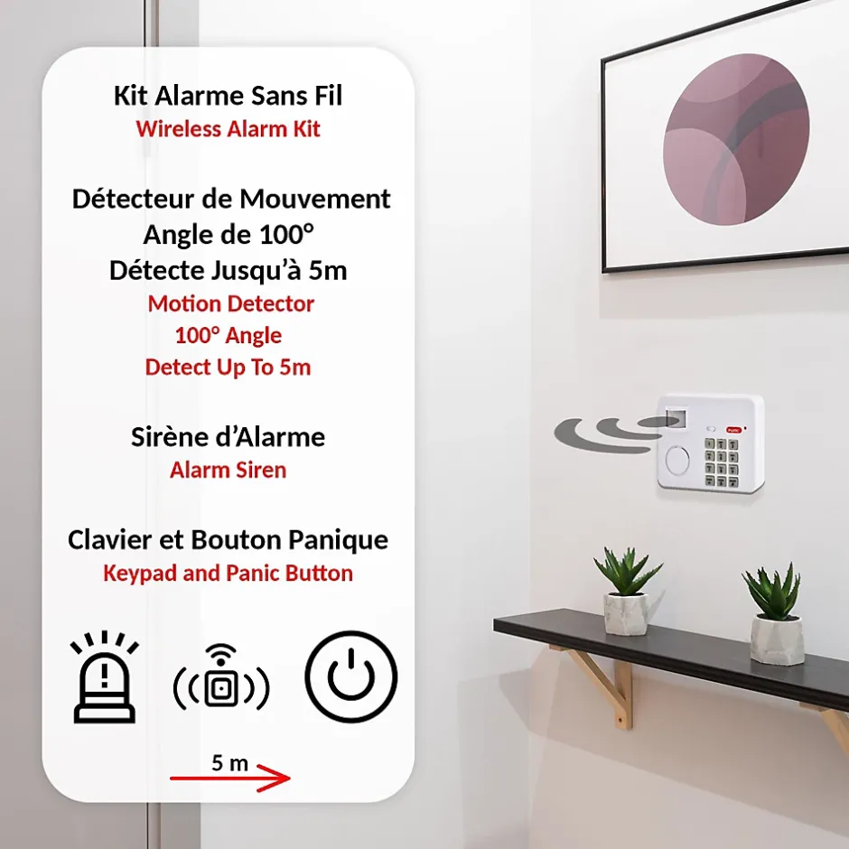 – ALARME SÉCURISÉ – notre alarme SafeAlarm de qualité vous permet de veiller à ce que personne ne pénètre dans votre maison, garage, abri de jardin ou sur votre lieu de travail par effraction. Grâce à elle, vous vous sentirez en sécurité – DÉTECTEUR DE MOUVEMENT – cet appareil a été conçu avec un détecteur de mouvement fiable offrant un angle de détection de 100° et une distance de détection de 5 mètres. S’il découvre une présence, une sirène ou un carillon s’enclenche alors automatiquement à votre guise – AUTONOME – notre alarme ne présente aucune difficulté d’installation. Il suffit de la fixer simplement sur un mur, sans raccordement filaire, et de l’alimenter par le biais de 3 piles AA LR06 pour votre plus grand confort – KIT COMPLET – notre produit comprend 1 kit alarme sans fil avec clavier de codage pour la programmation de votre choix et bouton panique et 1 notice d’installation et d’utilisation. Bénéficiez de la haute résistance de notre produit qui répondra à vos attentes – GARANTIE ET SATISFACTION – nous vous garantissons la fiabilité de nos produits techniques innovants faciles d’installation et d’utilisation qui allient confort et sécurité. Notre assistance technique basée en France se tient à votre disposition pour vous accompagner dans l’installation de votre produit. Nos techniciens vous assureront un conseil avisé et personnalisé. Votre satisfaction est notre priorité !