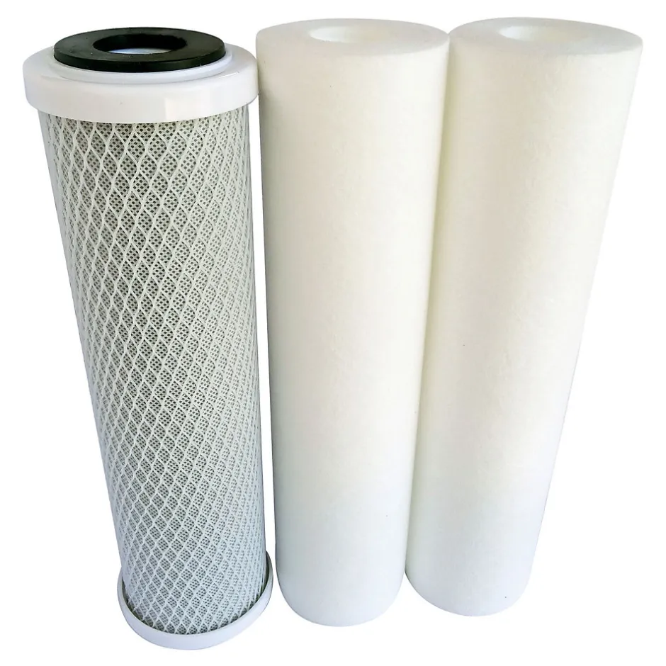 Ce kit de recharges pour osmoseur est composé de 2 cartouches extrudées anti-impuretés (de filtres 20µ et 5µ), et d’une cartouche de filtre à charbon actif de qualité alimentaire, anti-goût et anti-odeurs, destinées à purifier l’eau de consommation de la maison . Il filtre les sédiments, limon et particules avant leur passage sur le module d’osmose et permet la rétention des minéraux, pesticides et bactéries.
