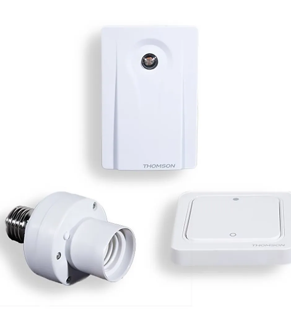 Optez pour une solution d’éclairage extérieur sans fil et automatisée et gagnez en confort.CONTENU DU KIT ET DESCRIPTIF : – 1 capteur crépusculaire : détecte les couchers et lever de soleil et ajuste l’éclairage en conséquence- 1 douille télécommandée E27 à visser- 1 télécommande murale à 2 positions (ON/OFF)CARACTERISTIQUES TECHNIQUES : ? Fréqu?n? r?d? : 868.3?z Capteur crépusculaire : ? Alimentation : 2 ?l? LR3 ?? (n?n f?urn??)? ?rté? ?n ?h?m? l?br? : 150m ? Indice de pr?t?t?n : ?44 (projection d’eau) ? ?l?r?: ?l?n?Douille télécommandée : ? Alimentation : 230. V?-50?z? ?u??n? m? : 100. W? ?rté? ?n ?h?m? l?br? : 150m? ?ém?n d? f?n?t?nn?m?nt? Type de culot : E27?élé?mm?nd? mur?l? ?n? f?l à 2 ??t?n?? Alimentation : 1 ?l? 12. V d? t?? 27?? Type de f??t?n : mur?l? ?n ??ll?? D?m?n??n?: [Hx. Lx. P] 80 x 80 x 12 mmCE QUE NOUS AIMONS : Ce kit THOMPSON permet d’automatiser votre système d’éclairage extérieur.Tous les accessoires sont faciles à installer et pilotables à distance .
