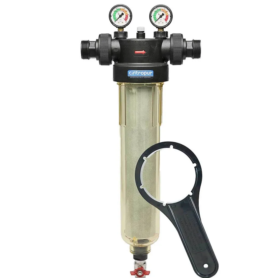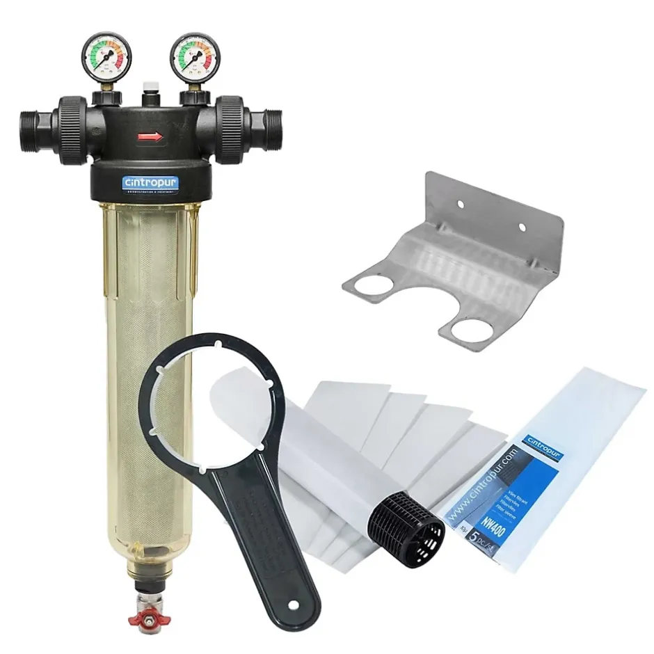Kit complet filtre anti impuretés Cintropur NW400 – avec équerre de fixation et sachet de 5 tamis 25 µLe kit complet filtre NW400 Cintropur est conçu pour le prétraitement de l’eau claire (eau de réseau, eau de pluie, forage…). Il élimine les particules solides : sable, rouille, boues, etc. Ce modèle intègre une hélice centrifuge qui permet d’utiliser la totalité de la surface de filtration du tamis et précipiter les sédiments dans le fond de la cuve.Applications du kit filtre cintropur :Filtration industrielle : Protège les reseaux sanitaires et les machines outils de production en éliminant les particules telles que le sable, la boue, la rouille, les algues et autres impuretés présentes dans l’eau de distributionPré-filtration : Il sert de pré-filtre pour d’autres systèmes de traitement de l’eau comme les adoucisseurs, les filtres à charbon actif, les osmoseurs…Filtration agricole : Sert de filtre pour les eaux d’arrosage ou d’abreuvage pour les animauxNotre kit filtre à sédiments comprend les éléments suivants :Filtre anti sédiments 25 micronsEquerre / Fixation murale Sachet de 5 tamis filtrant Cintropur pour NW400 – 25 micronsCaractéristiques du kit filtre a eau domestique cintropur :Type de produit : Filtre simpleMatériaux : Polyéthylène / SAN / ABS / PolyesterCouleur : NoirTempérature max : 50°CPression de fonctionnement : 10 barsPression maximale : 16 barsSeuil de filtration : 25 µmLavable : NonRaccordement entrée / sortie : 1″1/2- 40/49Installation : idéalement à l’entrée de l’installationDébit nominal : 12 m3/hSurface de filtration : 1010 cm²Manchon de filtration : JetableHauteur : 675 mmLongueur : 284 mmProfondeur : 152 mmGarantie : 2 ans