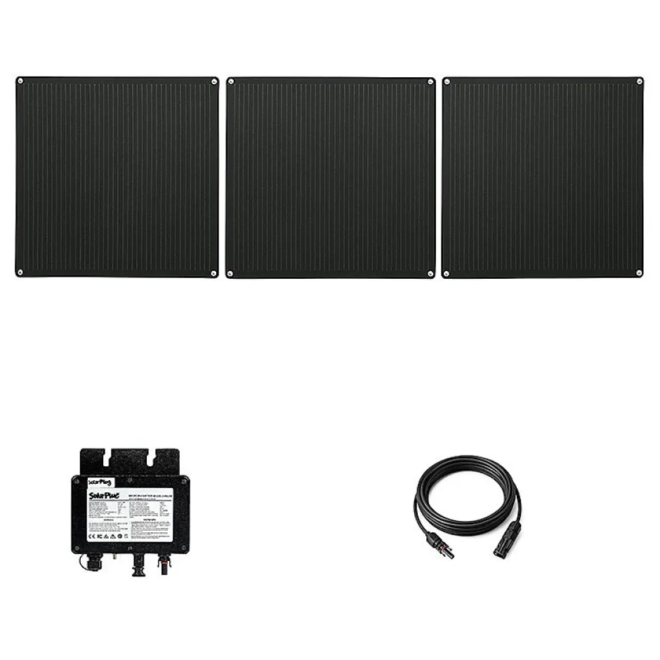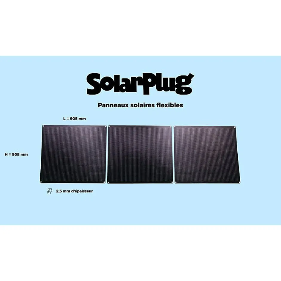 Kit panneaux solaires souple SolarPlug 405 W Ce kit solaire plug-and-play comprend 3 panneaux souples de 135 W chacun (total 405 W). Ultra-léger (5,4 kg), flexible et étanche, il est idéal pour une installation rapide et sans effort. Le micro-onduleur intégré permet un branchement direct sur prise 230 V, et l’application SMARTLIFE permet de suivre sa production en temps réel. Accessoires de fixation vendus séparément. Profitez dès maintenant de la livraison offerte ! Caractéristique Détail Puissance 405 W (3×135 W) Technologie Panneaux monocristallins PERC souples Poids 5,4 kg (10,6 kg emballé) Onduleur Micro-onduleur intégré, rendement 95 % Dimensions 90,5×80,8×0,25 cm / Câbles 3 m MC4 étanches Température -40 °C à +85 °C Étanchéité Connectique et onduleur IP étanche Garantie 5 ans / 10 ans fabrication / 25 ans performance Avantages Flexible, léger, et facile à installer Branchement rapide sur prise 230 V Convient aux surfaces murales, balcons, toitures, camping-cars, etc. Haute performance et durabilité avec garantie 25 ans Suivi de production via l’appli SMARTLIFE Points d’attention Fixation sur support stable recommandée Orientation sud et inclinaison 30-35° pour un rendement optimal Éviter toute ombre et bien emboîter les connecteurs MC4 Ne pas percer les panneaux en dehors des œillets Respecter la norme NF C15-100 pour l’installation électrique Livraison gratuite et expédition rapide dans toute la France métropolitaine.