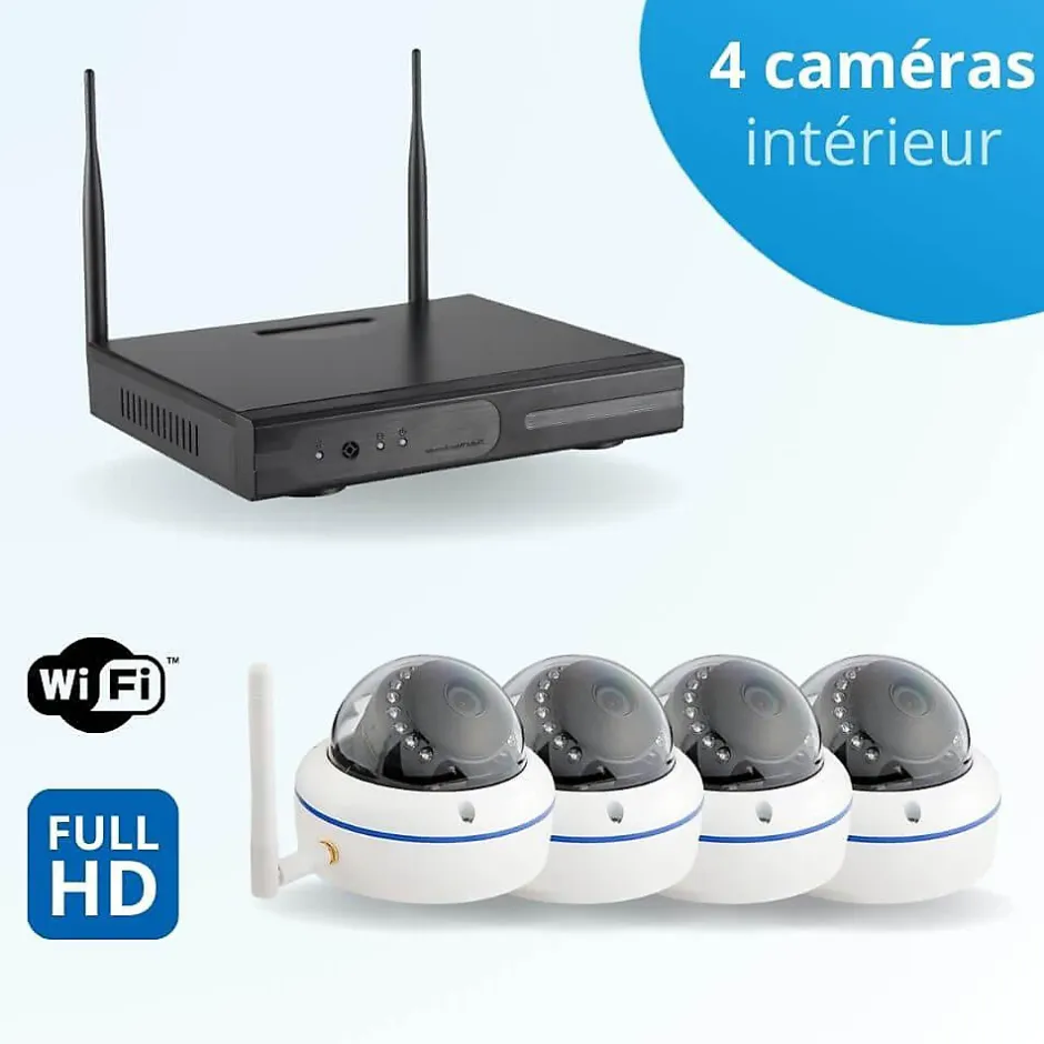 - Kit de télésurveillance complet de haute technologie prêt être posé tout en WIFI, composé de 4 caméras blanches, d’un enregistreur numérique H.264, d’une télécommande infrarouge, de 5 alimentations.