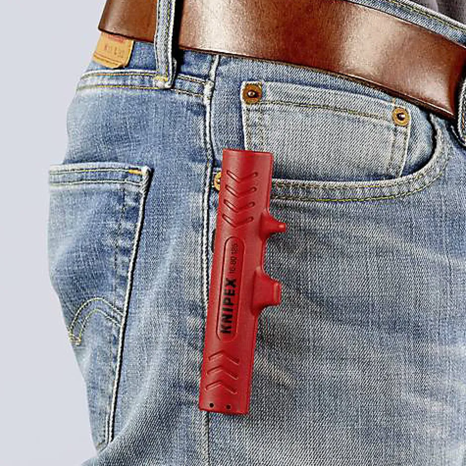 Outil à dénuder universel Knipex 16 80 125 SB, idéal pour dénuder câbles ronds et câbles destinés à pièces humides, ainsi que pour boîtiers répartiteurs. Boîtier en plastique renforcé par fibre de verre, équipé d’un ressort d’ouverture et d’un système de verrouillage, plus un clip de fixation pour un maintien fiable. Données techniques – Longueur : 125 mm, Poids : 71 g, Type : dénudeur de câble, Capacité de dénudage : Ø 8 à 13 mm (min. 8 mm, max. 13 mm).