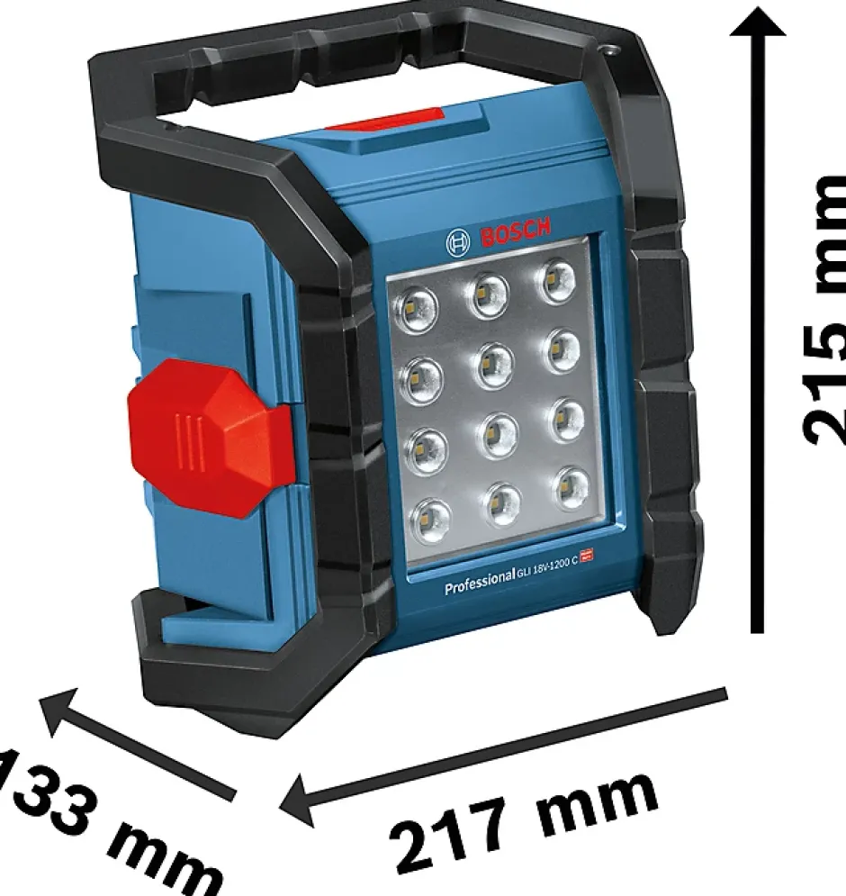Cette lampe 18V GLI 18V-1200 C de Bosch est un projecteur performant qui dispose d’une autonomie de 130 min/Ah, ainsi que 12 LED puissants capables de produire jusqu’à 1200 lumens. De ce fait, elle peut être utilisée pour éclairer des espaces de travail complets pendant toute une journée. Cet outil est également doté d’un couvre-batterie robuste et d’une protection contre les poussières et les projections d’eau (IP 64). Sa luminosité est réglable à distance à partir d’un smartphone. De plus, ses 2 niveaux de luminosité, son orientation possible dans 5 positions ainsi que son filetage de trépied de 1/4 » lui permettent de s’adapter rapidement à chaque situation de travail. Caractéristiques techniques :Eclairage uniforme d’une grande zone de travailProtection contre les poussières et les projections d’eau5 angles d’inclinaisonTension de la batterie 14,4 – 18 VNombre de niveaux de luminosité : 2Dimensions : 217x133x215 mm