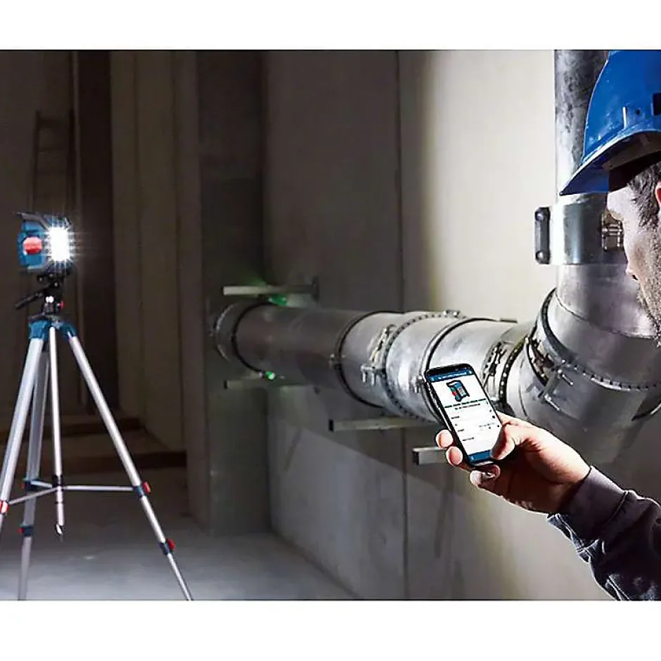 Lampe GLI 18V-1200C offrant un flux lumineux jusqu’à 1 200 lm avec 12 LED puissantes, protection IP64 et deux niveaux de luminosité pour un éclairage adapté à chaque situation. Contrôlez la lampe à distance via la tuile MyTools de l’application Toolbox et profitez de la compatibilité trépied 1/4″ et Bluetooth pour un positionnement et un pilotage faciles. Batterie 100 % compatible avec les outils 14,4/18 V (batterie et chargeur non inclus).