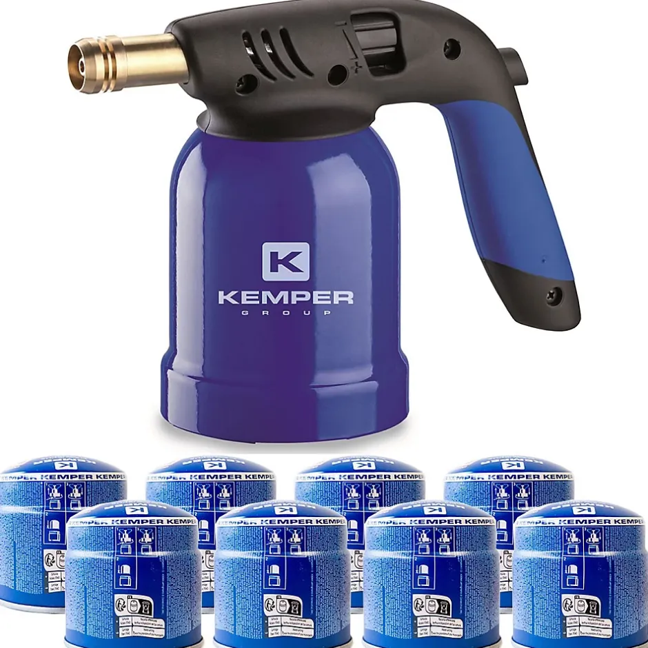 Kit lampe à souder KEMPER + 8 cartouches 190g Perçable sécurité stop gaz. Système Allumage piézo. Conçue en acier avec peinture antichocs et verrou de sécurité avec poignée ergonomique. Idéal pour tous travaux domestiques et courants. Température de la flamme 1200°C.