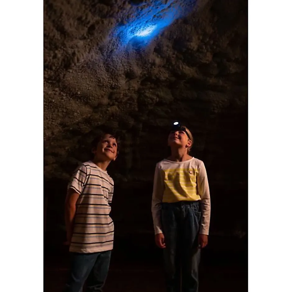 Lampe frontale Bosch pour enfant avec bandeau réglable, 2 modes (continu et clignotant), portée 8 m, fonctionne sur 2 piles LR6 AA (non fournies).