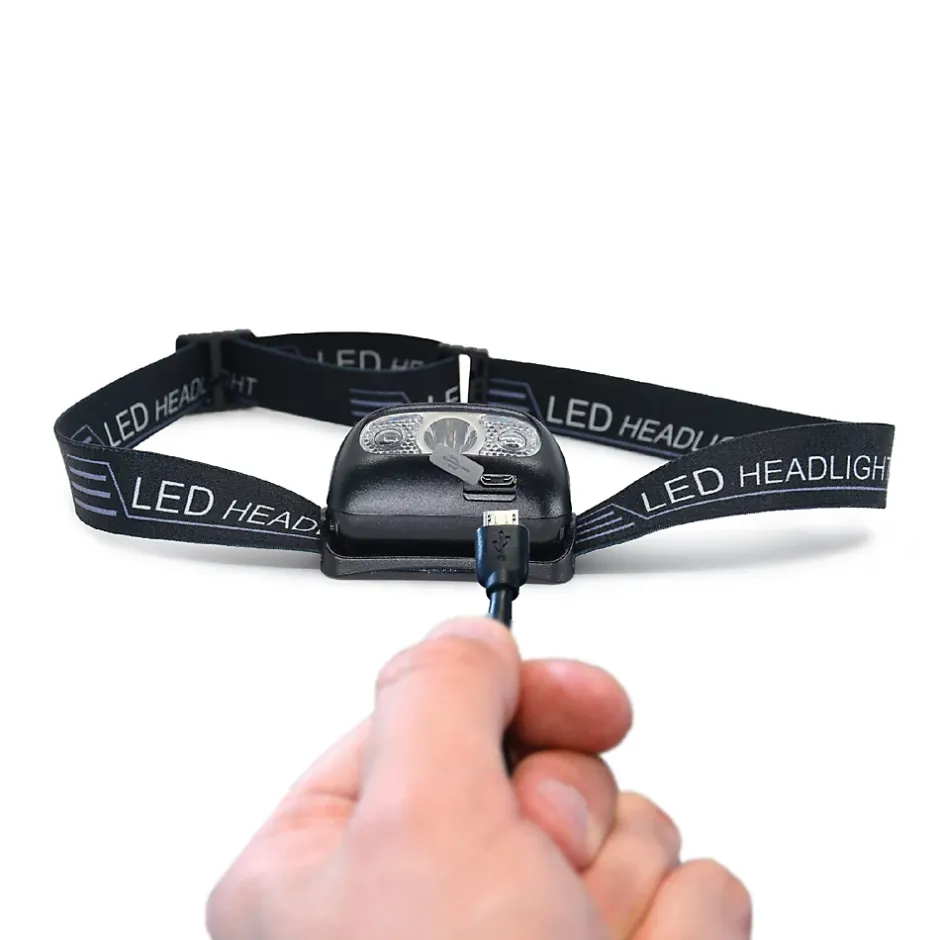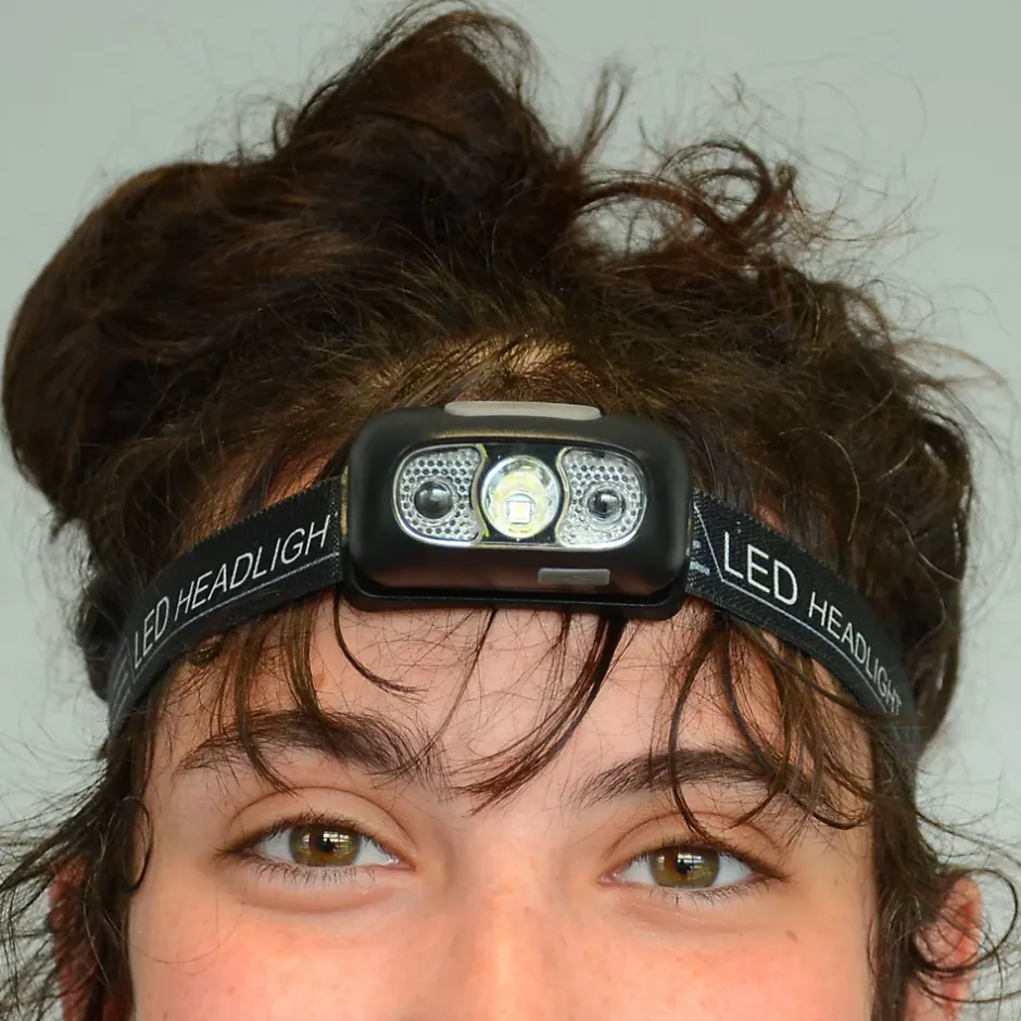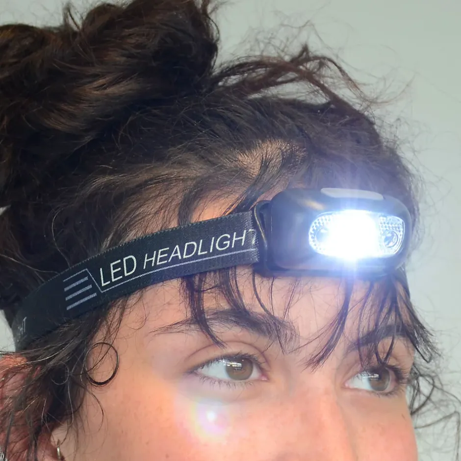 Une lampe frontale parfaite pour vos activitésBricolage, sport, activités en extérieur ou encore rangement : posée sur votre front, cette lampe est adaptée à ces activités qui nécessitent d’avoir les mains libres. Illuminant à 75 mètres, certifiée IP55 contre la poussière et la pluie, votre lampe est solide. Un dispositif astucieux et pratiqueNotre lampe frontale est pratique. Légère, elle tient dans votre poche. Son bandeau est flexible et réglable, confortable à porter. Disposant de quatre heures d’autonomie, la lampe frontale demande trois heures pour se recharger par un simple câble USB (fourni). Éclairez comme bon vous sembleBien positionnée sur votre front, la lampe s’incline pour orienter la lumière selon vos besoins. En plus, vous disposez de quatre intensités d’éclairage : Une intensité élevée Une intensité moyenneUne intensité faible Une fonction clignotant Deux modes pour allumer et éteindre la lampe frontaleD’une simple pression sur le bouton ON/OFF, ou d’un passage de la main devant le détecteur de mouvement inclus dans la lampe, vous allumez et éteignez votre accessoire. Pratique si vous avez par exemple la main prise. Découvrez le contenu du kitCONTENU DU KIT : La lampe et son bandeau Le c
