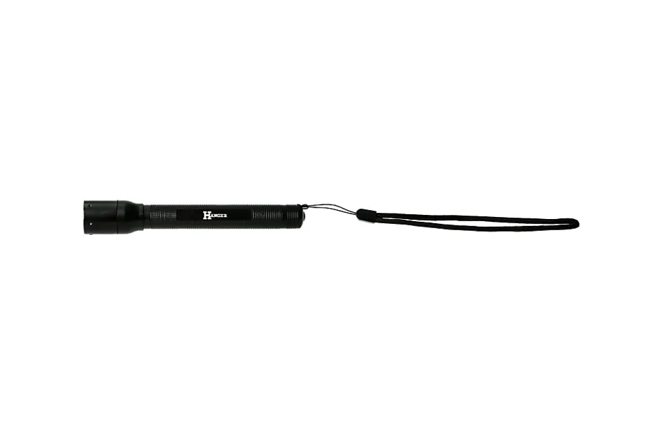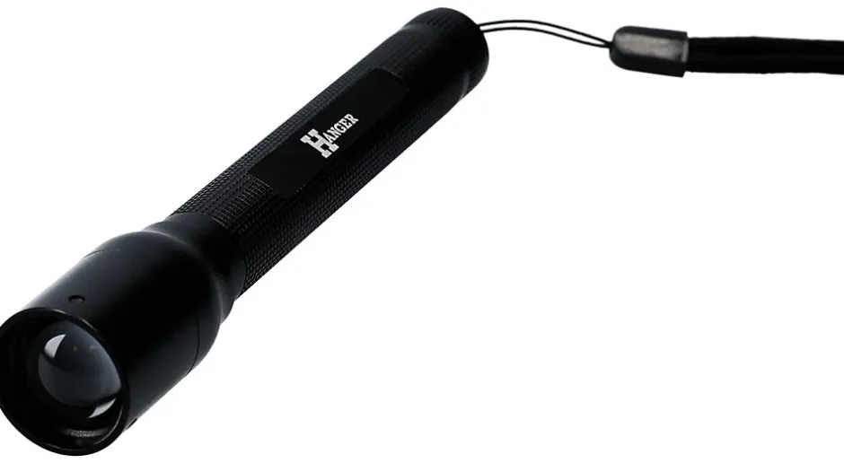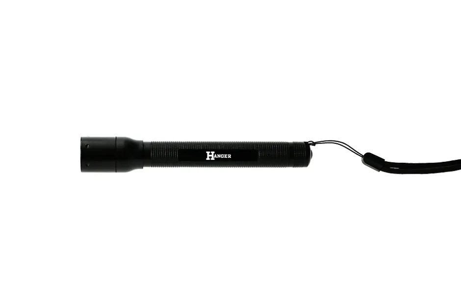 Torche portée HANGER Blacklight 2 compacte et légère, corps aluminium mat, LED CREE 1 W jusqu’à 150 lumens, focus réglable pour un faisceau précis, livrée avec deux piles LR06 et bracelet poignet, conçue pour usage professionnel et extérieur. Garantie fabricant 2 ans.