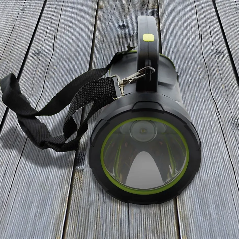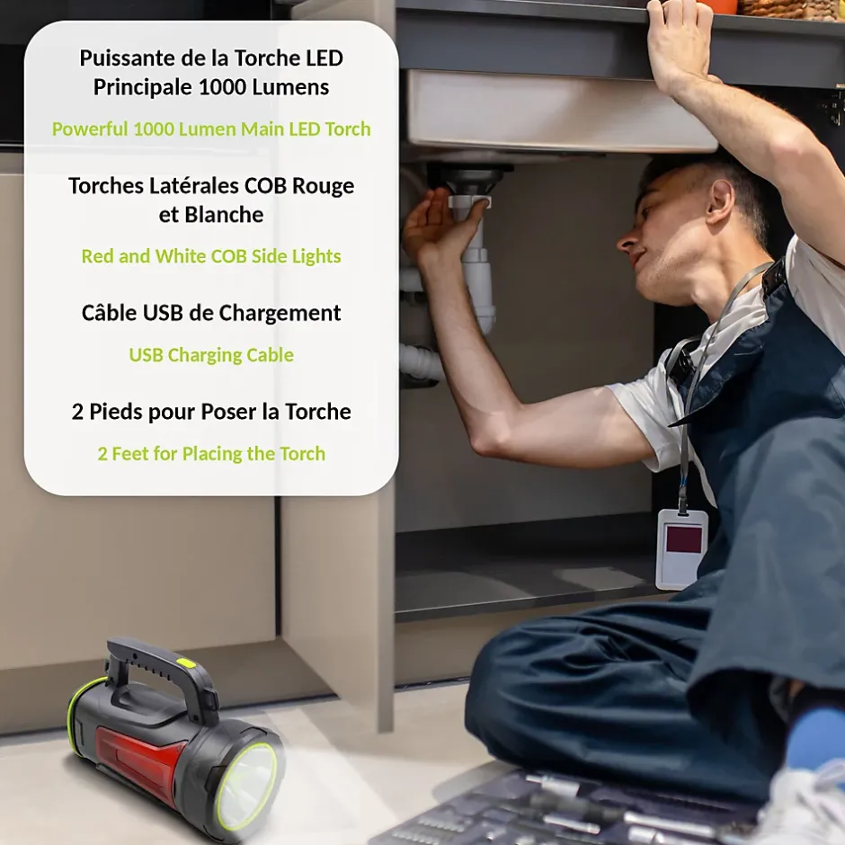 ULTRA PUISSANTE – La torche principale équipée d’une LED OSRAM de 1000 lumens offre un faisceaux lumineux avec 3 modes d’éclairage ( 100% – 50% clignotant) avec une portée de 1000 m. Sur un des côtés vous disposez d’une lumière blanche avec 2 choix d’intensité (100% – 50 %) permettant d’éclairer efficacement votre zone de travail. Sur l’autre côté une lumière rouge fixe ou clignotante permet de vous signaler la nuit.RECHARGEABLE – La torche rechargeable dispose d’un câble de rechargement USB intégré qui se range directement autour de la torche. Plus de risque de le perdre ou l’oublier. Enfin, un témoin de charge vous indique le pourcentage de batterie restant.BATTERIE EXTERNE – La Lampe Torche LED dispose d’un port USB et un port micro USB permettant de l’utiliser comme batterie externe ou power Bank afin de recharger votre smartphone portable ou tablette pratique quand vous manquez de batterie pour vous ambiance par exemple dans votre camping préféré.PORTABLE – La poignée ergonomique et la bandoulière permettent de l’utiliser et de l’emmener partout avec vous. Son format compact et léger permet le transport facilement. Vous ne partirez plus sans votre lampe torche ultra puissante en vacances.CARACTERISTIQUES – Matières : ABS – Alimentation : Batterie Lithium 18650 rechargeable 5W – Câble de chargement intégré (26 cm) – Torche 1000 Lumens – Led OSRAM – Portée 1000m – Lumière blanche – COB – 2 modes (100% – 50%) – Lumière rouge – COB – 2 modes (100% / clignotant)