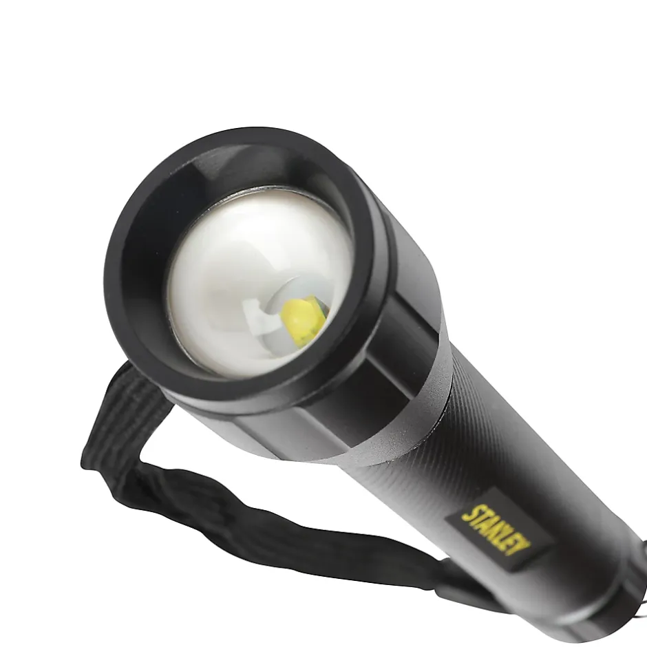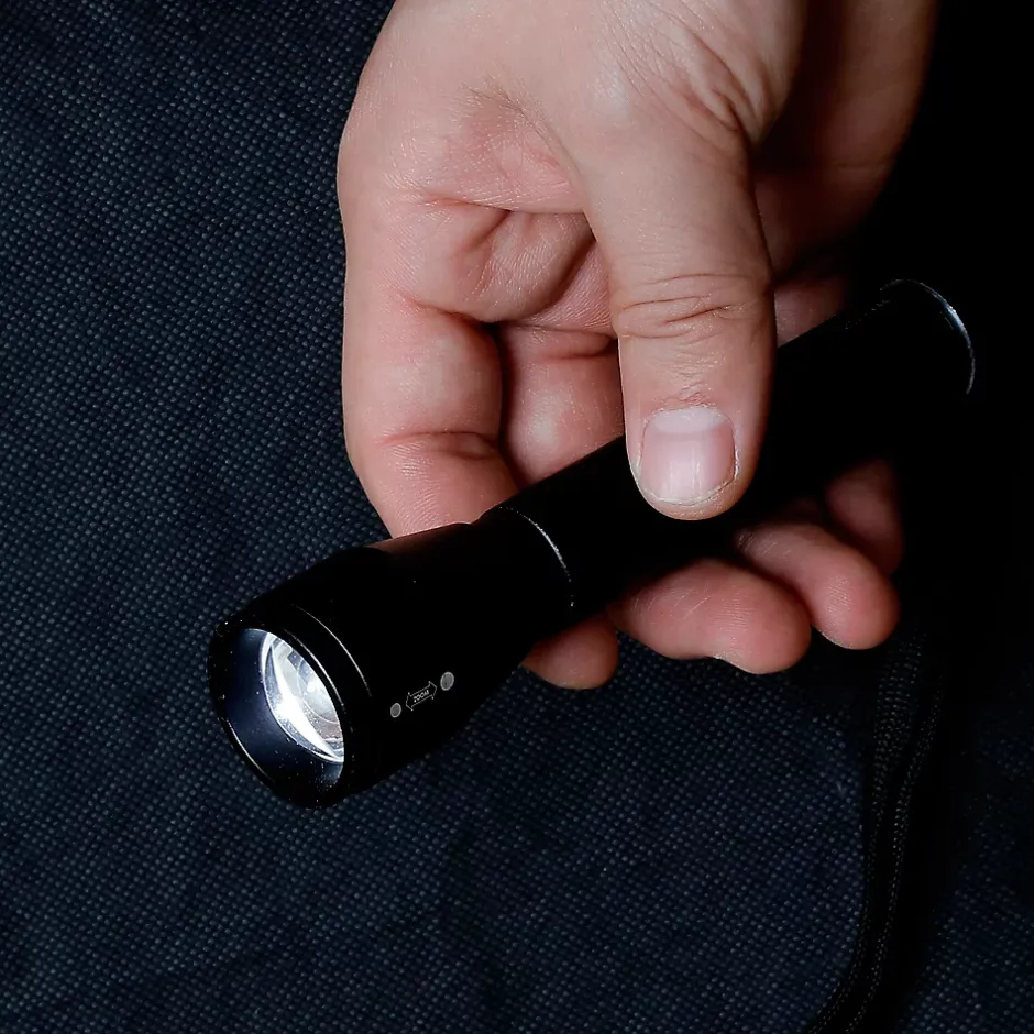 Cette lampe torche compacte en aluminium est légère avec une bonne prise en main. Elle dispose d’un interrupteur à son extrémité et d’une fonction zoom pour ajuster le faisceau