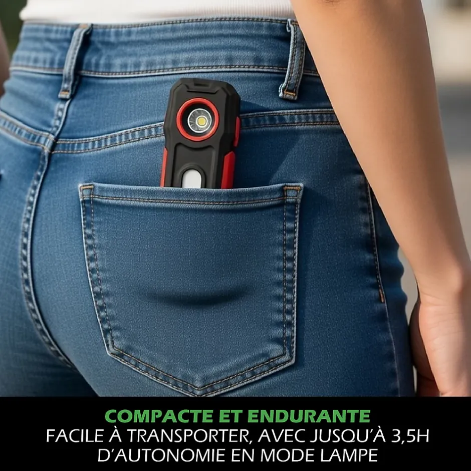 - Fonctionnalités pratiques pour une utilisation mains libres : Support rotatif à 180° et aimant puissant pour fixer la lampe sur des surfaces métalliques, permettant un éclairage précis sans avoir à la tenir.