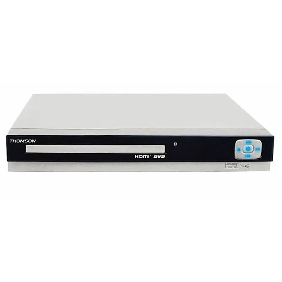 Lecteur DVD Thomson THD301W blanc avec upscaling 1080p, HDMI, Péritel et port USB ; compatible de nombreux formats audio et vidéo. Boîtier compact de table, télécommande multifonctions incluse.