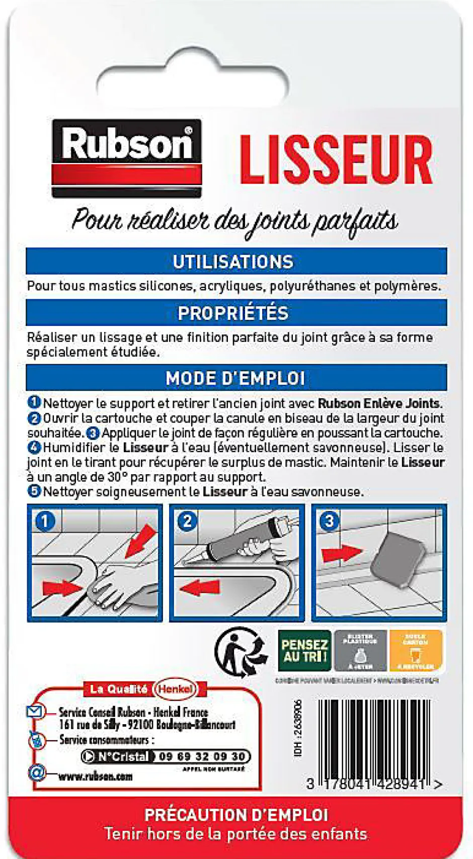 Le RUBSON lisseur est fabriqué en matière polyéthylène souple pour une ‘non’ adhérence au contact des différents mastics à lisser. Cet outil permet de lisser les mastics afin de réaliser des joints parfaits. Ce lisseur est compatible avec tous types de mastics : acryliques, silicones, polyuréthanes et polymères hybrides. Il permet de réaliser un lissage et une finition parfaite grâce à sa forme spécialement étudiée : 4 angles de lissage possible. Il est lavable et réutilisable. Il est adapté au lissage de la plupart des joints : baignoires, lavabos, éviers, bacs à douche, plans de travail, pourtours de portes et fenêtres, plinthes, etc.