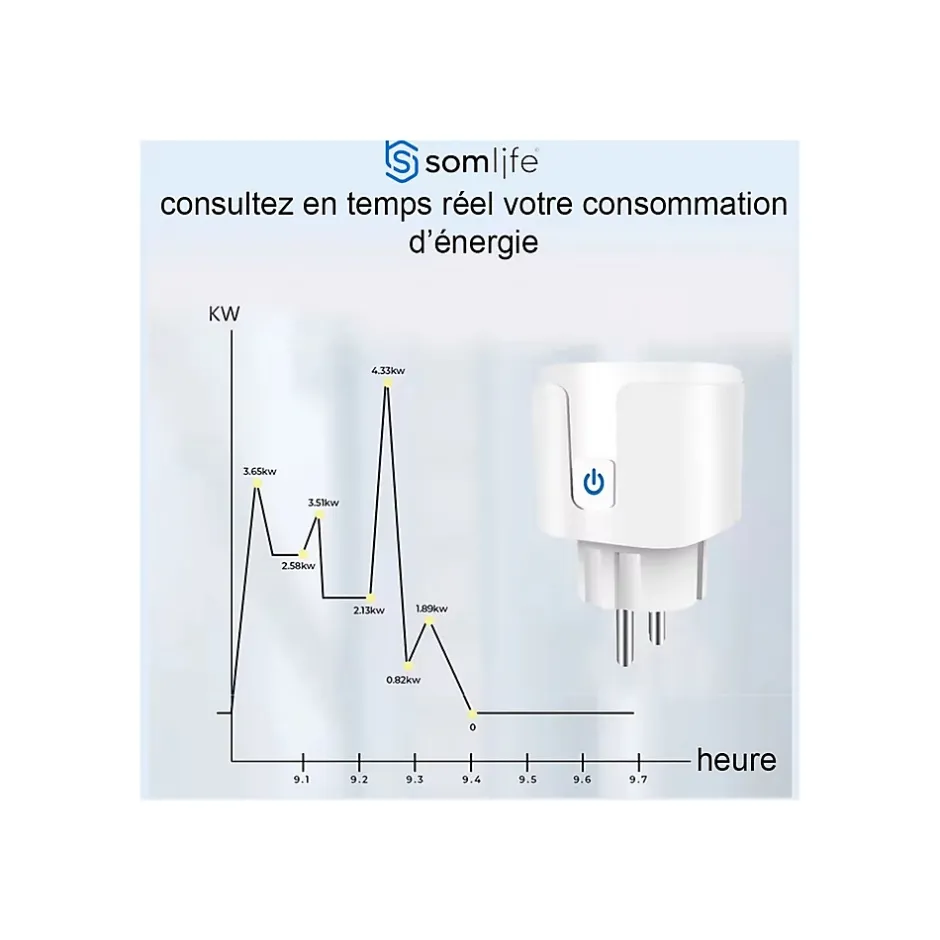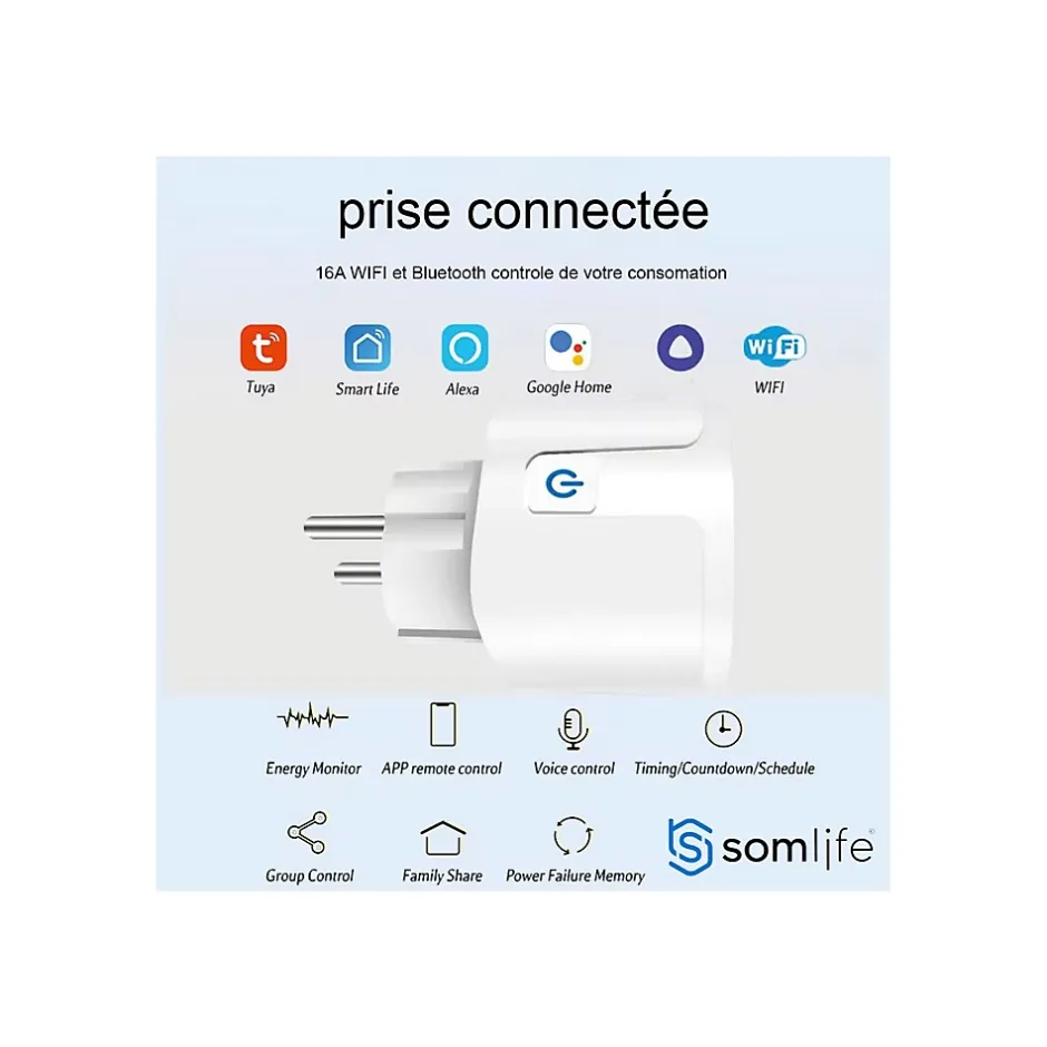 Transformez votre maison en un espace intelligent et économe en énergie avec la prise connectée Somlife, intégrant parfaitement Tuya Smart Life dans votre système domotique.Contrôle vocal intelligent : Compatible avec Amazon Alexa et Google Assistant, cette prise vous permet de contrôler vos appareils d’un simple mot, offrant une commodité mains libres inégalée.Programmation personnalisée : Planifiez des horaires automatiques pour allumer ou éteindre vos appareils tels que le ventilateur et le climatiseur, optimisant ainsi votre confort tout en économisant de l’énergie.Suivi de la consommation d’énergie : Surveillez précisément la consommation d’énergie de vos appareils avec des statistiques détaillées par jour, semaine, mois et année, vous aidant à gérer efficacement votre consommation.Prévision des coûts d’électricité : Estimez les coûts d’utilisation de vos appareils en saisissant le prix de l’électricité dans l’application, vous permettant de mieux gérer votre budget énergétique.Installation et utilisation intuitives : Connectez facilement la prise à votre réseau Wi-Fi existant (2.4GHz uniquement) en quelques minutes. Son interface conviviale rend son utilisation accessible à tous, sans nécessiter de compétences techniques particulières.Partage d’appareils : Partagez l’accès à la prise connectée avec votre famille et vos amis, leur offrant les mêmes fonctionnalités pratiques et de contrôle à distance.Protection contre la surcharge électrique : Activez le mode de protection contre la surcharge pour prévenir tout excès de charge de vos appareils connectés.Gestion facile des groupes d’appareils : Regroupez plusieurs prises connectées et contrôlez-les simultanément d’un seul clic, simplifiant la gestion de plusieurs appareils et rendant votre quotidien plus fluid…