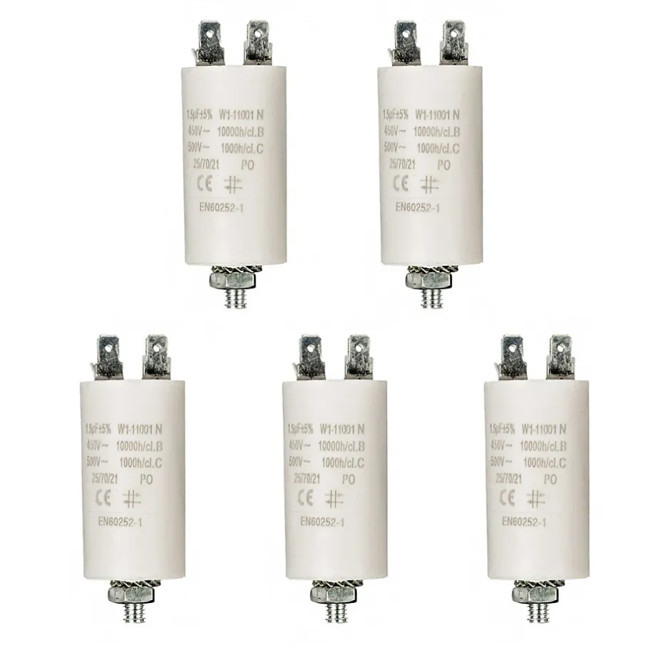 Lot de 5 condensateursCondensateurs ronds dans un boîtier ignifuge. Isolés et hautement étanches à l’eau.Facile à monter grâce aux double cosse faston 6.mm et a la vis M8. Convient pour lampes et moteurs 50/60Hz.Condensateurs permanents 1.5µf 450V pour moteurs électriques.Dimensions : 30 x 57 mmSorties cosses faston 6.3mmTension d’utilisation : 220VTension max : 450VFréquence nominale : 50 / 60 HzTolérance de capacité : +/- 5%Température de travail : -25°C à +85°CNorme de référence : EN 60252Classe B : 10000 heuresPeut remplacer tout condensateur permanent de 1,5 µF dont la tension plaquée est comprise entre 400V et 500V, dont (entre autres):ITALFARAD séries RP2.1,5 et RP3.1,5 DUCATI série 4-16-10 et 4-16-17ARCOTRONICS séries 1.27-4ACMKP 1.27-6CCMKP 1.27-7LAMKPCOMAR Condensatori type MKA1.5-450 – 1,5µF – 450V – Sortie cosses