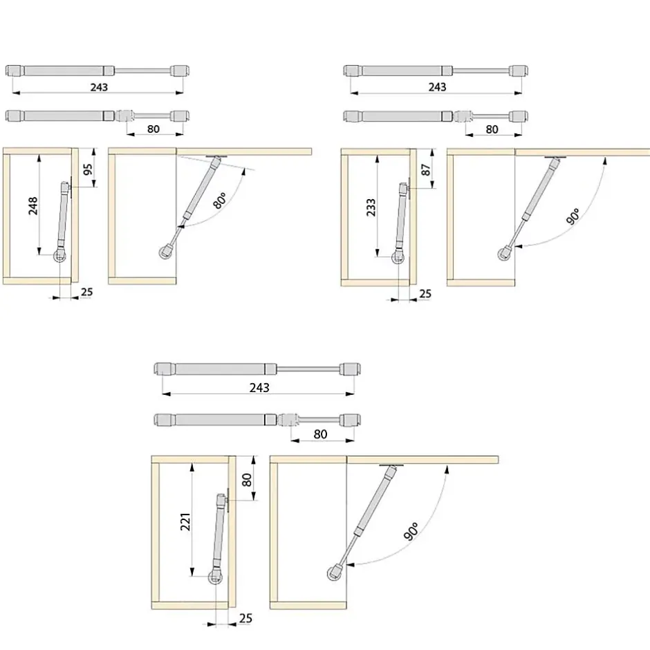 Piston amortisseur pour portes relevables en bois ou avec cadre en aluminium. Conçu pour amortir l’ouverture brusque des portes des meubles pour la cuisine, la maison et la salle de bain. Force du piston 5 kg. Course ou parcours du piston 80 mm. Possibilité de montage indifféremment sur le côté droit ou gauche du meuble. Fourni dans des sachets individuels avec instructions de montage. Chaque sachet contient 1 piston, 1 fixation latérale, 1 fixation pour portes en bois, 1 fixation pour porte avec cadre en aluminium et les vis pour le montage. Fabriqué en acier et plastique avec finition gris métallisé. VOIR LES MESURES DU PRODUIT DANS LES IMAGES. Piston amortisseur pour portes relevables en bois ou avec cadre en aluminium. Conçu pour amortir l’ouverture brusque des portes relevables des meubles pour la cuisine, la maison et la salle de bain.Les pistons amortisseurs sont fournis dans des sachets individuels avec instructions de montage. Chaque sachet contient un piston, une fixation latérale, une fixation pour portes en bois, une fixation pour porte avec cadre en aluminium et les vis pour le montage.