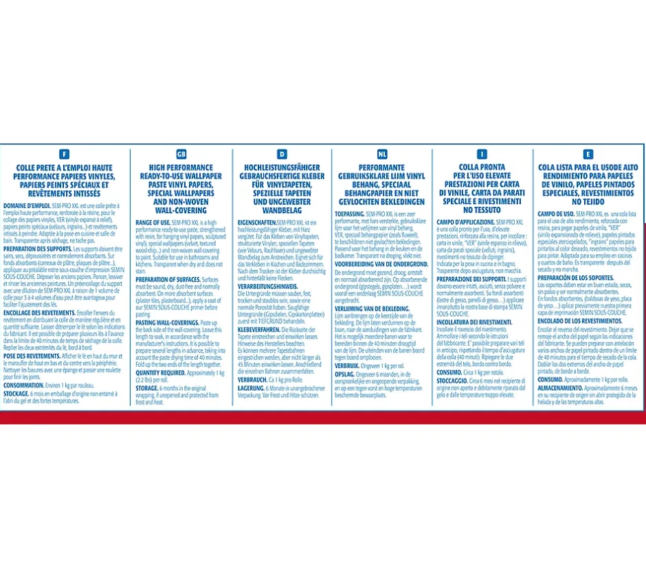COLLE PAPIERS PEINTS – HAUTE PERFORMANCE – PRÊTE À L’EMPLOICe pack contient :Colle papiers peints Sem-Pro XXL, 2 seaux de 5 kgLa colle prête à l’emploi est idéale pour coller divers types de papiers peints :• Papiers vinyls ;• Vinyls expansés à relief ;• Revêtements textiles légers ;• Revêtements intissés à peindre ;• Papiers peints spéciaux (velours, ingrains…) ;• Adaptée aux locaux humidesOn applique la colle prête à l’emploi sur des supports comme les plaques de plâtre, les carreaux de plâtre et le béton ou l’enduit ciment.LES AVANTAGES DE LA COLLE PAPIER PEINTLa colle spéciale pour papier peint possède des avantages intéressants pour poser les papiers vinyls, les papiers peints spéciaux et revêtements intissés (velours, ingrains…) :• Une capacité d’adaptation à tous les types de papiers peints ;• Une invisibilité au séchage ;• Une grande facilité d’utilisation ;• Une excellente adhérence même dans les pièces humides (salle de bains, cuisine) ;• Une haute performance ;• Une colle prête à l’emploi ;• Un produit qui ne tache pas.CARACTÉRISTIQUES TECHNIQUESPoids : 5 kgDensité : Environ 1Aspect : Colle en pâteComposition : Base d’amidon, d’éther de cellulose, de résine, d’eau et d’agents de conservationStockage : 6 mois en emballage d’origine non entamé à l’abri du gel et des fortes chaleurs (température de stockage entre 0 et 30° C) & 1 à 2 mois après la première ouverture.Consommation : 200 g/m²Usage : Intérieur – murs et plafonds