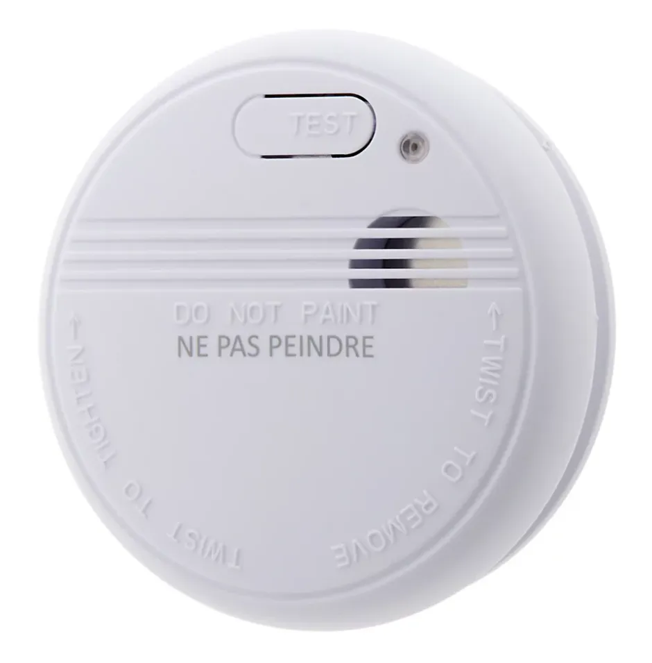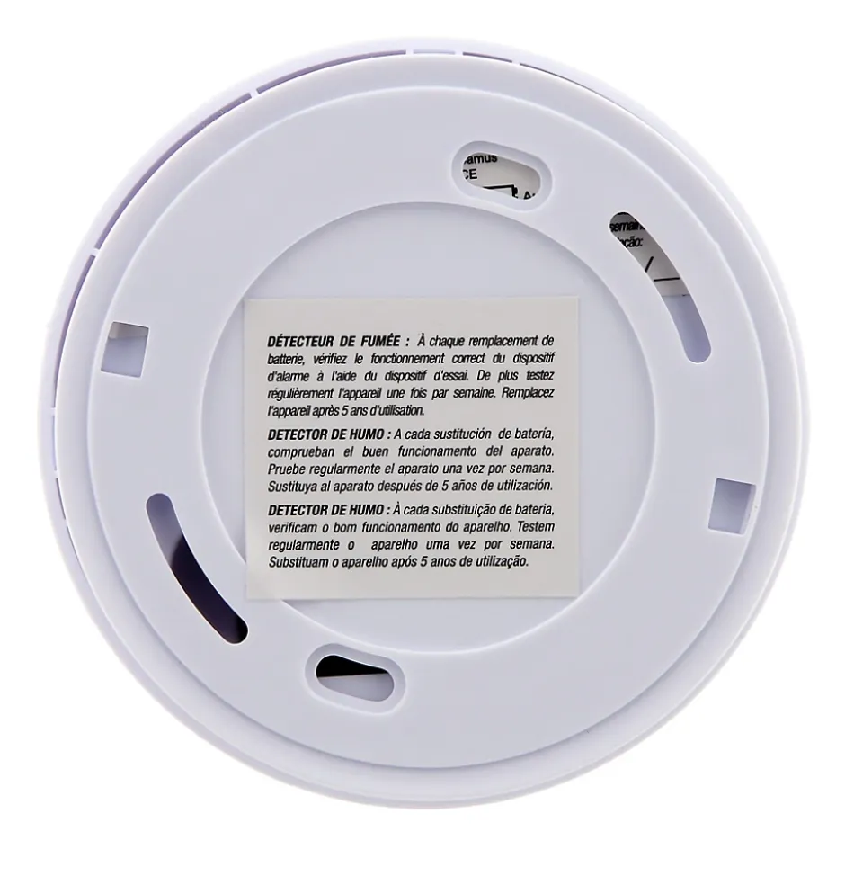 Détecteur de fumée. Autonomie des piles : 5 ans. Chevilles et vis de montage incluses. Dimensions : Ø 7 x 3.5 cm. Garantie : 5 ans. Norme(s) : CE et NF