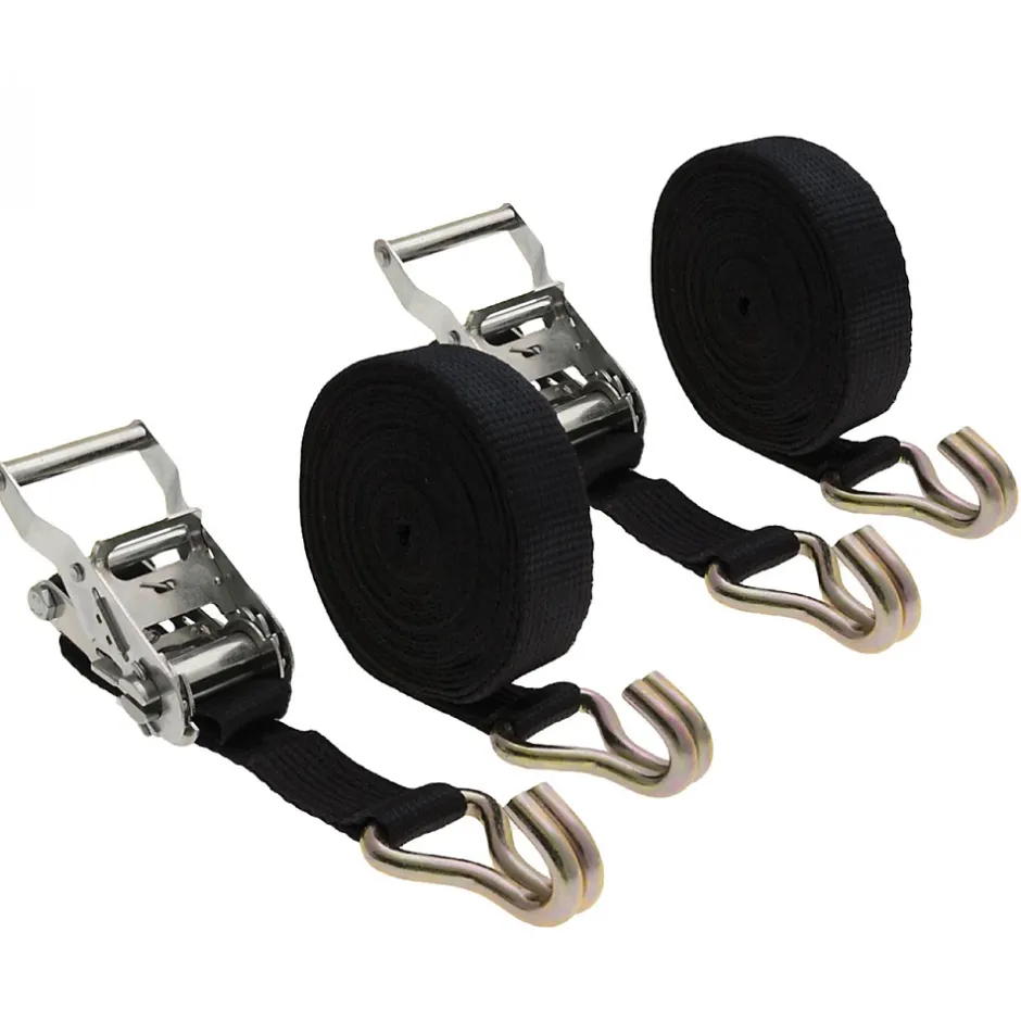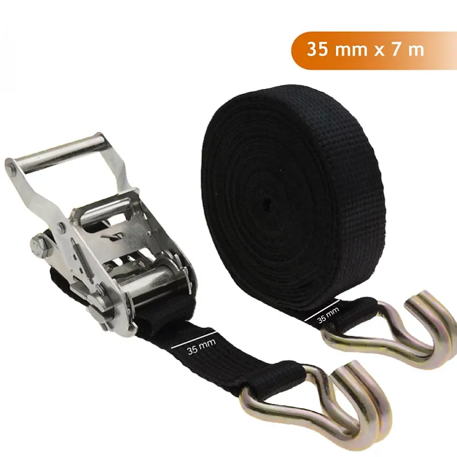 Le lot de 2 sangles avec tendeur à cliquet et 2 crochets, 35 mm x 7 m Linxor se compose de deux sangles disposant chacune d’un tendeur à cliquet et de deux crochets de type doigts soudés pour maintenir votre chargement fixement et fermement.Chaque sangle est réalisée en polyester et a une excellente robustesse à l’abrasion et aux U.V, associée à un cliquet en acier chromé et deux crochets, ce lot de sangles a ainsi une haute résistance et une grande longévité.Chacune des sangles à cliquet et 2 crochets doigts peut supporter une tension maximale d’utilisation (TMU) de 1000 kg en boucle et 500 kg en bout droit.Ce lot de sangles est de couleur noire et chaque sangle mesure 7 m en longueur, 35 mm de largeur.Disponibles en d’autres packs.Conforme à la norme : EN 121 95-2.