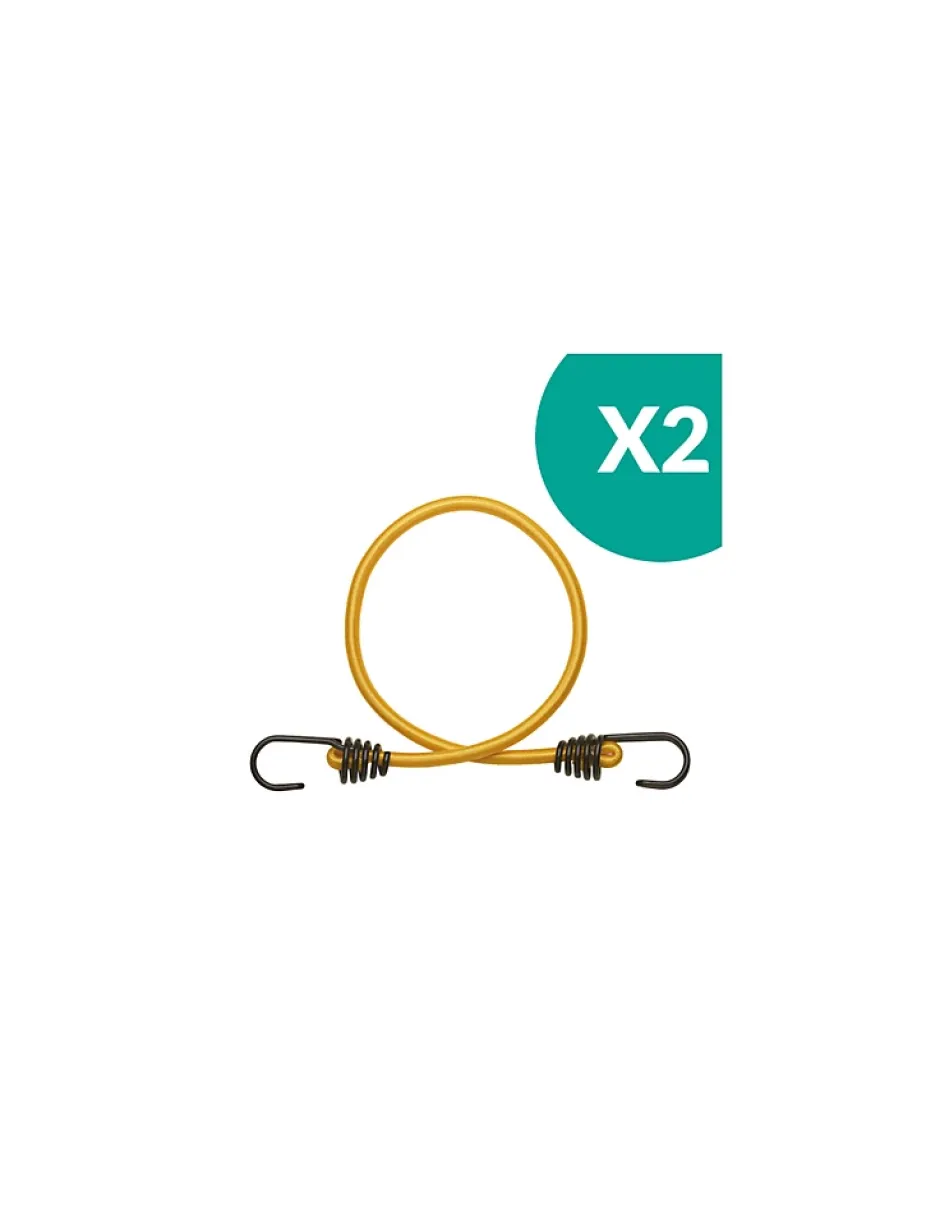 Lot de deux tendeurs, cordon en caoutchouc de latex, crochets en acier double. Jaune. Longueur 60cm. Pour rangement, camping, vélo, remorque …