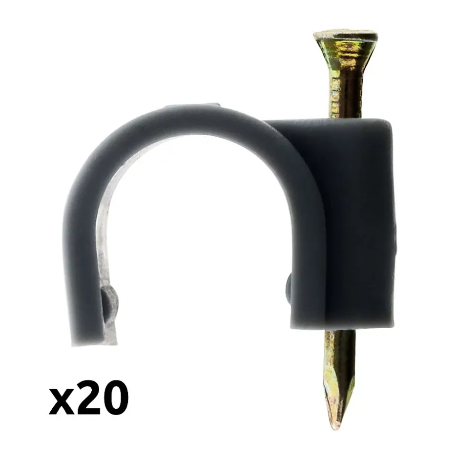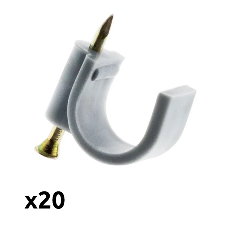 Lot de 20 attache clips ou crochets de fixation. Couleur(s) : blanc ou gris. Différents diamètres au choix. Avec clou spécial béton. Ces crochets permettent de fixer des câbles et autres gaines au mur. Convient particulièrement aux câbles TV. Norme(s) : CE