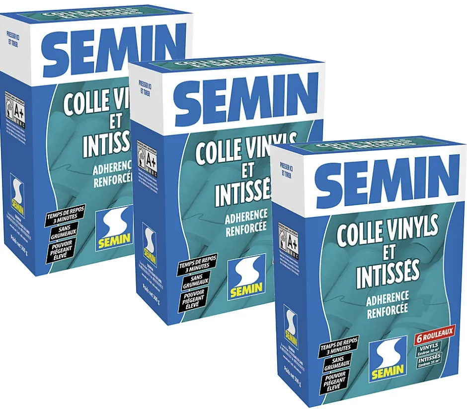 COLLE IDÉALE POUR TOUS LES PAPIERS PEINTS STANDARDS ET INTISSÉSLa colle à papier peint Semin est un produit idéal pour les papiers peints standards et intissés, légers et lourds.Elle se présente sous la forme d’une poudre, dans une boîte de 300 grammes.Ce pack contient :Colle en poudre pour papiers peints vinyls et intissés, 3 boites de 300 gPOURQUOI CHOISIR LA COLLE PAPIER PEINT EN POUDRE ?On privilégie la colle à papier peint Semin pour différents papiers peints : vinyles plats, expansés relief (VER), lourds et pour intissés et papiers à envers intissé.On applique cette colle papier peint en poudre sur différents supports (plaques de plâtre, carreaux de plâtre, béton ou enduit ciment, plâtre).LES AVANTAGES DE LA COLLE A PAPIER PEINTOn utilise volontiers la colle papier peint en poudre pour ses avantages intéressants :• Une préparation prête en trois minutes ;• Une pâte sans grumeaux ;• Une application aisée ;• Un pouvoir piégeant élevé ;• Prête en 3 min.CARACTÉRISTIQUES TECHNIQUESPoids : 300 grSupports admis : Plaque de plâtre, carreaux de plâtre, béton, enduit, ciment et plâtreStockage : Au secPréparation : Eau froideRendement : Environ 6 rouleauxUsage : murs et plafonds