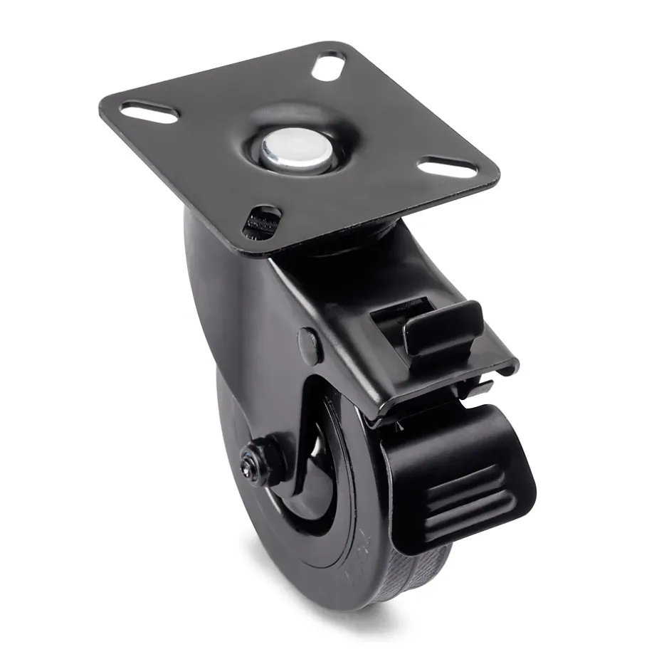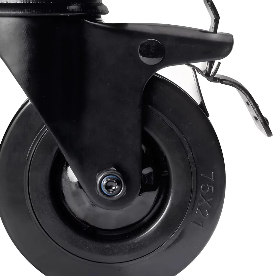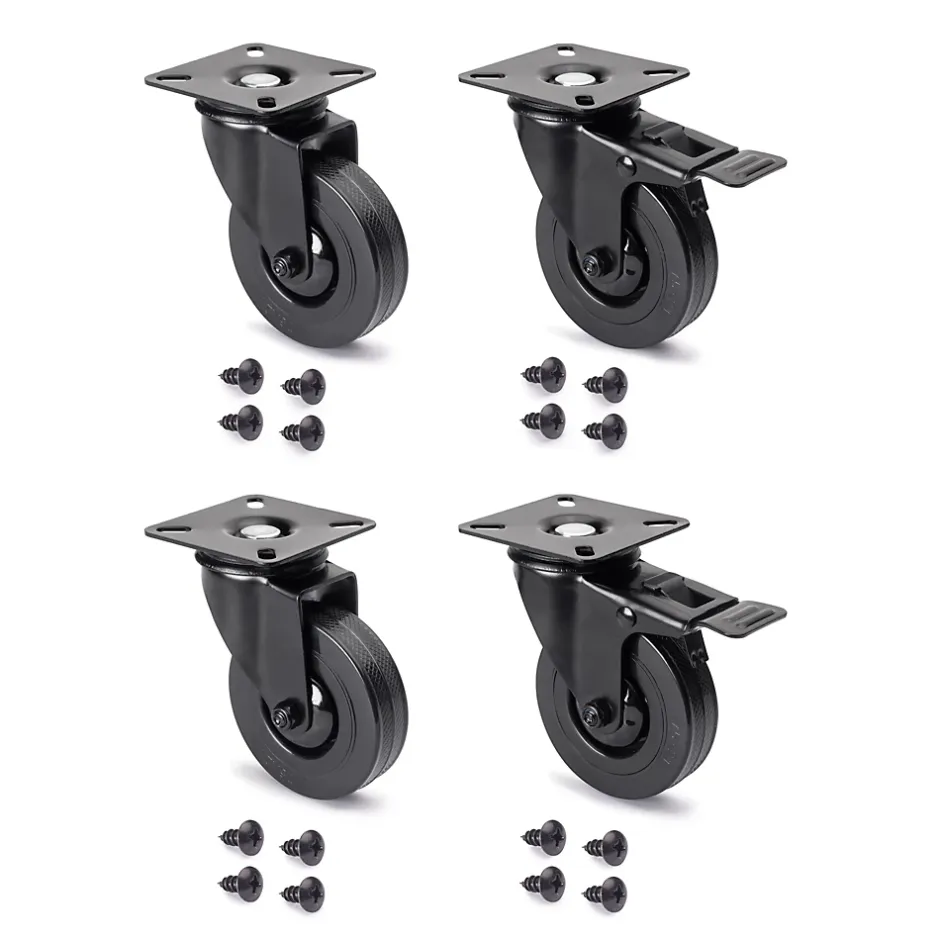 Set de 4 roulettes pour meuble: 2 roulettes avec frein et 2 roulettes sans frein.Diamètre de la roulette: 75 mm.Monture en tôle acier zinguée et bandage de roulement en caoutchouc noir.Platine à visser au meuble (vis de montage compris).PCapacité de charge de 40 kg par roulette. VOIR LES MESURES DU PRODUIT DANS LES IMAGES. Roulettes noires avec plétine de montage idéales pour tous les meubles de la maison et du bureau, pour caissons à tiroirs, ainsi que pour les chambres d’enfants.Chaque kit contient 2 roulettes avec frein, 2 roulettes sans frein et les vis de montage.De facile installation, ces roulettes permettent d’optimiser et améliorer vos meubles grâce à leur roulements à billes, chi fournit un glissement doux et silencieux.