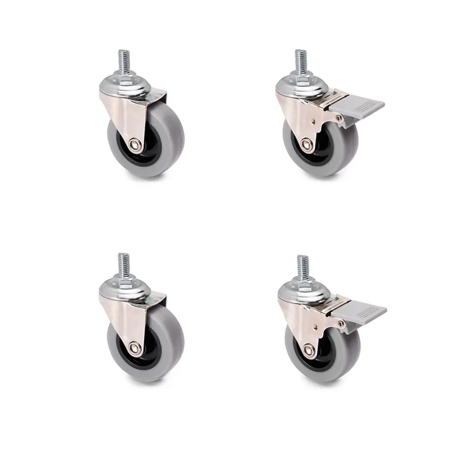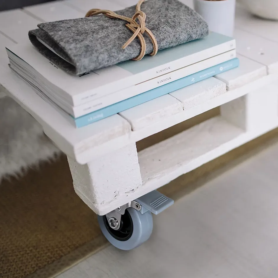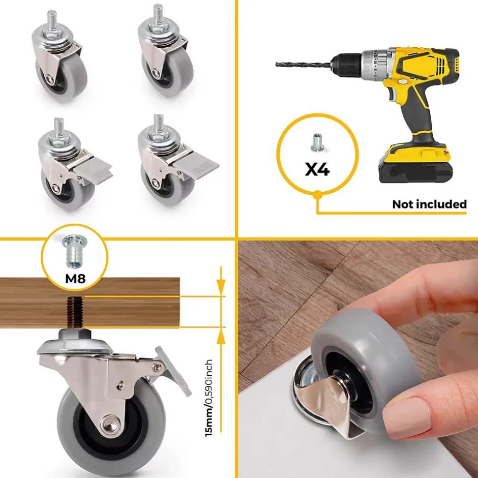 Kit de 4 roulettes: 2 avec frein et 2 sans frein.Diamètre de la roulette: 50 mm.Structure en plaque d’acier et plastique couleur gris. Bande de roulement en caoutchouc grisBoulon métrique M8 x 15 mm pour le montage sur le meuble.Capacité de charge 30 kg par roulette. VOIR LES MESURES DU PRODUIT DANS LES IMAGES. Les roulettes Slip 2 sont idéales pour tous les meubles de la maison et du bureau. Chaque kit contient 2 roulettes avec frein, 2 roulettes sans frein et les vis de montage. Les roulettes Slip 2 sont faciles à installer.