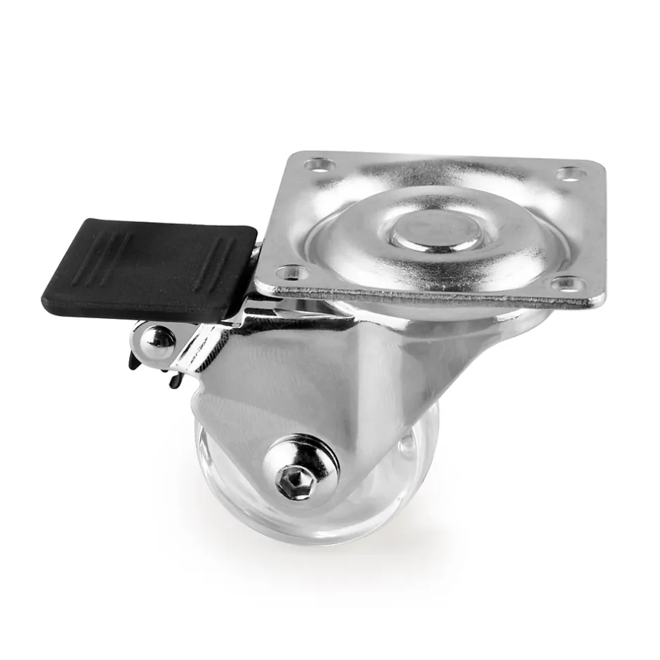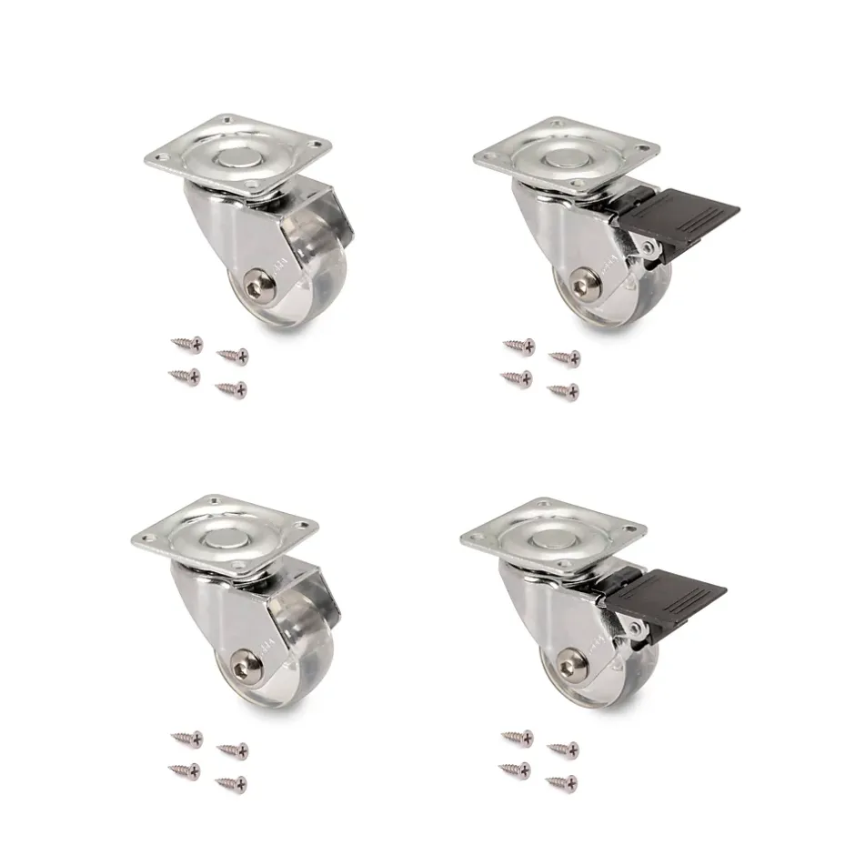 Les roulettes transparentes Slip avec platine sont idéales pour tous les meubles de la maison et du bureau, pour caissons à tiroirs, ainsi que pour les chambres d’enfants. Chaque kit contient 2 roulettes avec frein, 2 roulettes sans frein et les vis de montage. Les roulettes transparentes Slip sont faciles à installer.