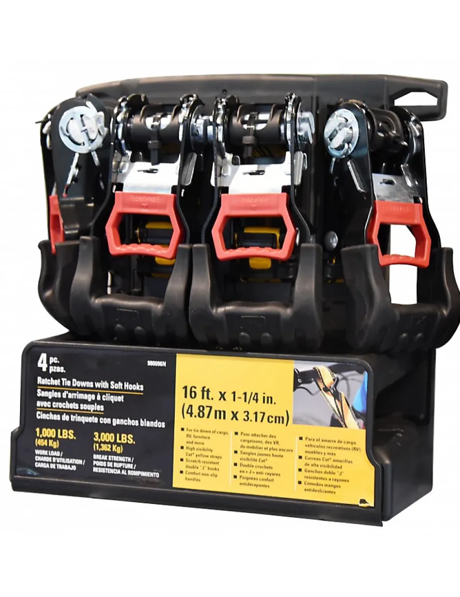LOT DE 4 SANGLES D’ARRIMAGE A CLIQUET CATERPILLAR AVEC CROCHETSLONGUEUR : 4.87 MLARGEUR : 3.17 CMCHARGE D’UTILISATION : 454 KGSPOIDS DE RUPTURE : 1362 KGSIDEAL POUR ATTACHER LES CARGAISSONS, DU MOBILIER ….SANGLE JAUNE HAUTE VISIBILITEDOUBLE CROCHET EN « J » ANTI RAYURESPOIGNEE CONFORT ANTIDERAPANTE
