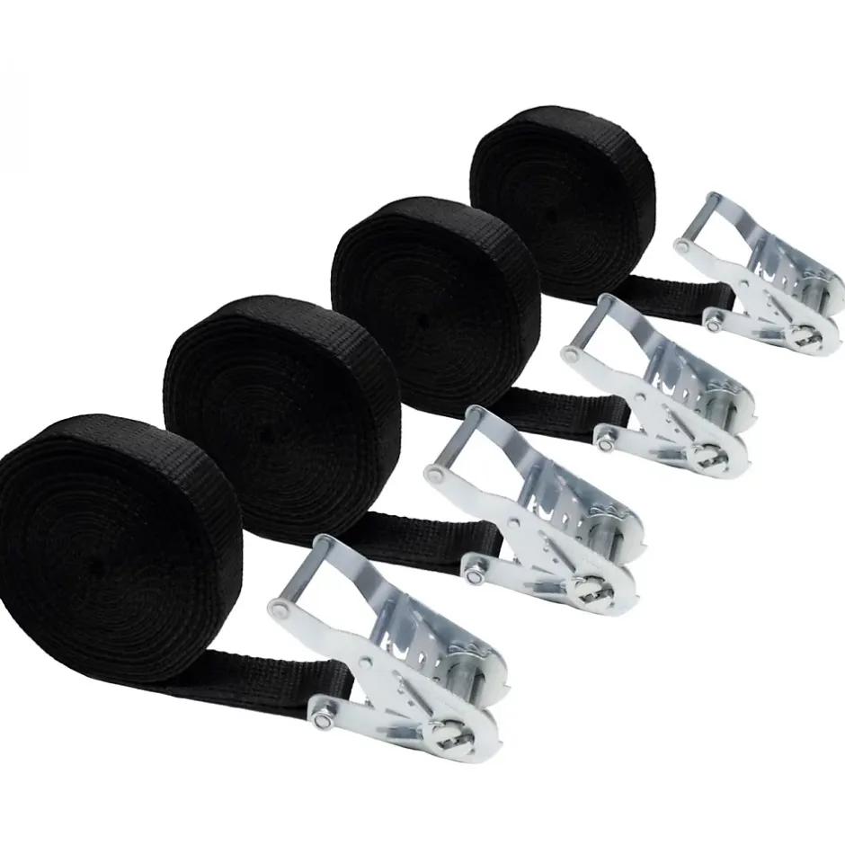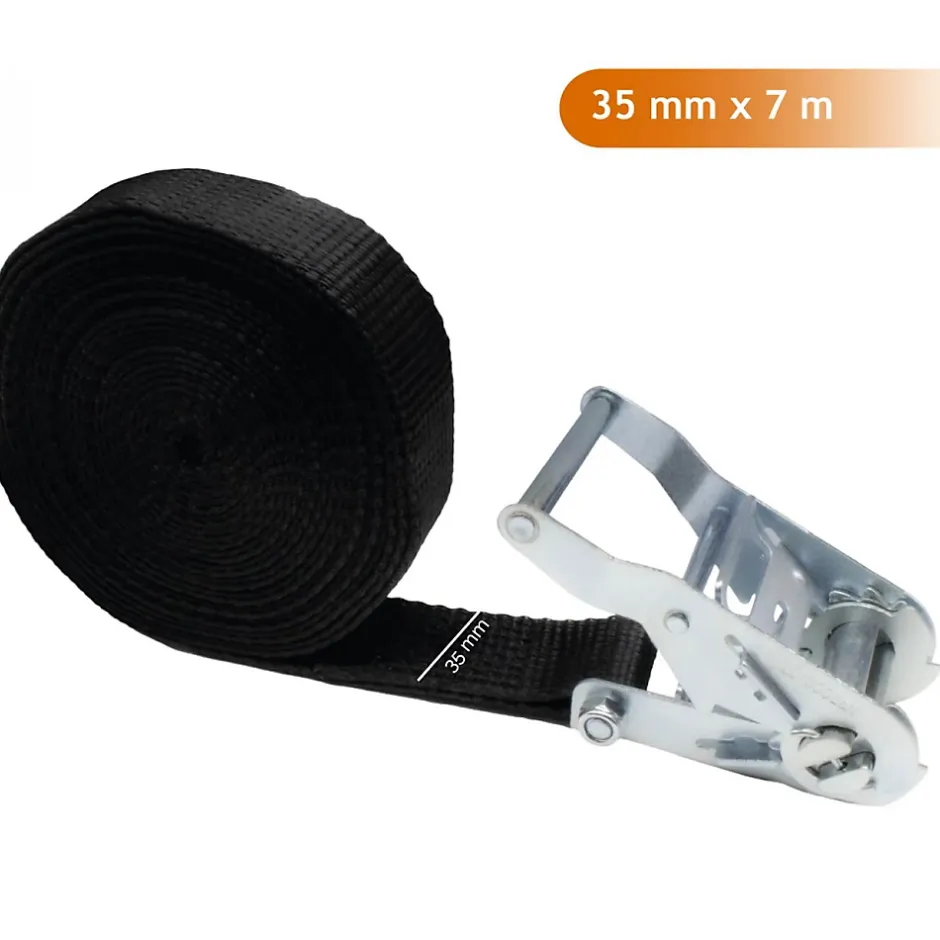 Ce lot de 4 sangles à cliquet 35 mm x 7 m de Linxor est parfait pour maintenir votre chargement et satisfaire tous vos besoins en matière d’arrimage.Chaque sangle est réalisée en polyester et a une excellente robustesse à l’abrasion et aux U.V, associée à un tendeur à cliquet en acier chromé, ce lot de 2 sangles à cliquet a ainsi une haute résistance et une durabilité maximale.Chacune des sangles à cliquet peut supporter une tension maximale d’utilisation (TMU) de 1000 kg en boucle et 500 kg en bout droit.Dimensions : 7 m en longueur et 35 mm de largeur. Coloris noir.Conforme à la norme : EN 121 95-2.Autres dimensions et packs disponibles.