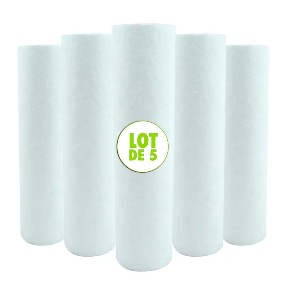 Lot de 5 cartouches de filtre à sédiments 5 microns pour porte filtre 9″ 3/4 et osmoseurCartouches microfibre modèle Meltblown de haute qualité, elles assurent une filtration importante des impuretés organiques fines présentes dans l’eau.Ce pack de cartouches filtrantes anti-sédiments est conçu pour offrir une solution efficace et économique pour la filtration des impuretés dans l’eau. Les cartouches sont fabriquées en microfibre Meltblown, assurant une filtration fine jusqu’à 5 microns. Pour l’installation de cette cartouche vous pourrez vous équiper d’un porte filtre simple ou d’un double porte filtre transparent insert laiton 1″ ou 3/4″ compatible en taille standard 9″3/4 ou disponible sur notre boutique.