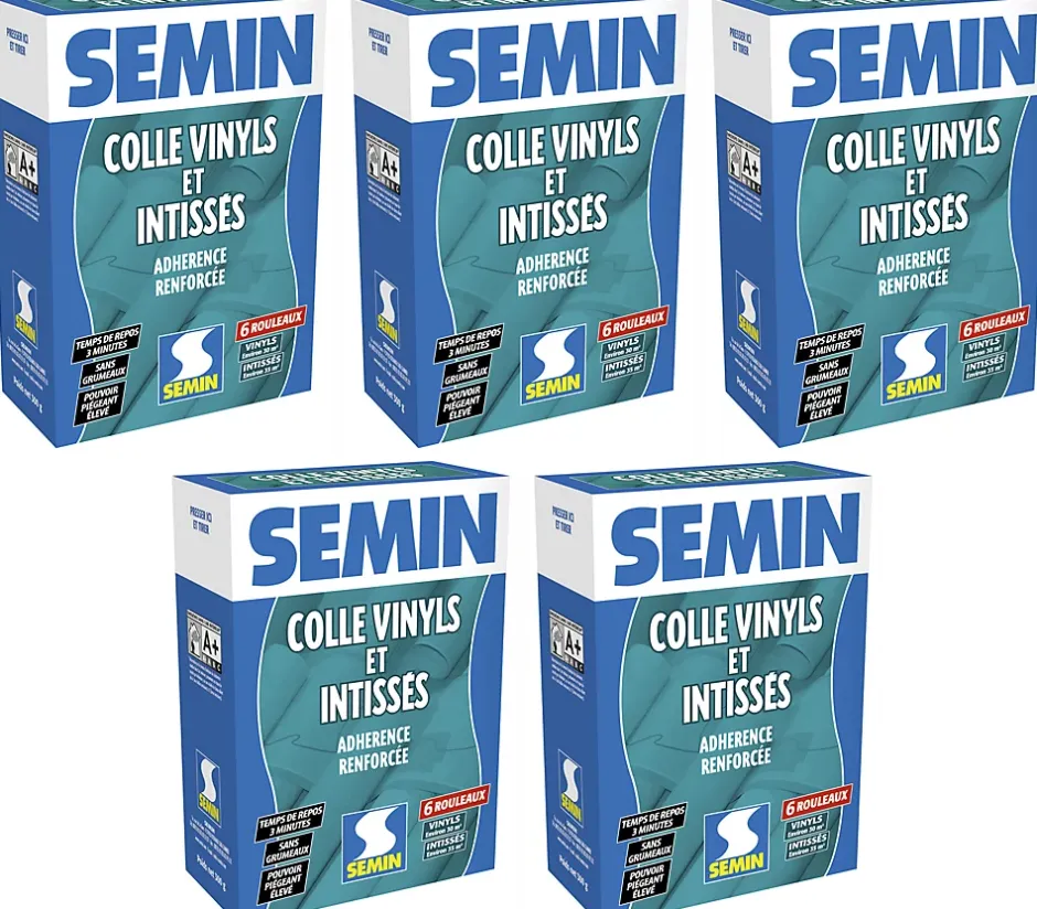 COLLE IDÉALE POUR TOUS LES PAPIERS PEINTS STANDARDS ET INTISSÉSLa colle à papier peint Semin est un produit idéal pour les papiers peints standards et intissés, légers et lourds.Elle se présente sous la forme d’une poudre, dans une boîte de 300 grammes.Ce pack contient :Colle en poudre pour papiers peints vinyls et intissés, 5 boites de 300 gPOURQUOI CHOISIR LA COLLE PAPIER PEINT EN POUDRE ?On privilégie la colle à papier peint Semin pour différents papiers peints : vinyles plats, expansés relief (VER), lourds et pour intissés et papiers à envers intissé.On applique cette colle papier peint en poudre sur différents supports (plaques de plâtre, carreaux de plâtre, béton ou enduit ciment, plâtre).LES AVANTAGES DE LA COLLE A PAPIER PEINTOn utilise volontiers la colle papier peint en poudre pour ses avantages intéressants :• Une préparation prête en trois minutes ;• Une pâte sans grumeaux ;• Une application aisée ;• Un pouvoir piégeant élevé ;• Prête en 3 min.CARACTÉRISTIQUES TECHNIQUESPoids : 300 grSupports admis : Plaque de plâtre, carreaux de plâtre, béton, enduit, ciment et plâtreStockage : Au secPréparation : Eau froideRendement : Environ 6 rouleauxUsage : murs et plafonds