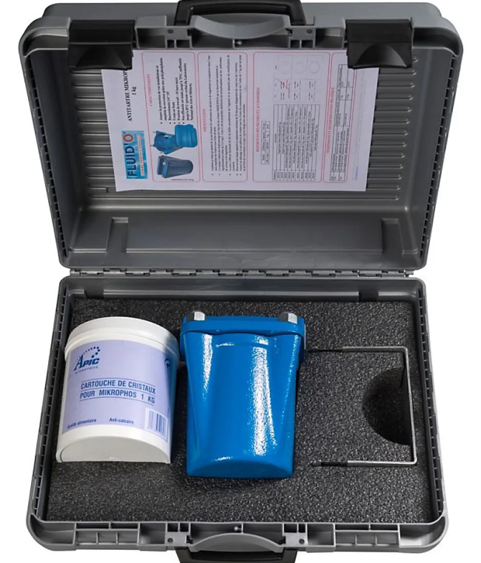 MIKROPHOS : La solution au tartre Malette complète pour lutter efficacement contre le calcaire = Anti-tartre MIKROPHOS 1 kg Corps en fonte grande résistance fourni avec sa cartouche de cristaux de polyphosphate et son support acier de fixation murale. Jour après jour le calcaire attaque et détruit les installations. Il entartre les canalisations d’eau, les appareils de production d’eau chaude, les circuits d’eau de conditionnement d’air. Il réduit les diamètres des conduites, provoque ainsi une chute du débit et les bruits de distribution.L’énergie est gaspillée par déperdition calorifique à travers la croûte isolante du calcaire.Les joints se détériorent et provoquent des fuites des chasses-d’eau, des robinets. Malette comprenant : – 1 MIKROPHOS 1 kg Série 3 (réf. 3002000) – 1 cartouche de rechange (réf. 350069) – 1 support de fixation murale acier pour station Mikrophos (réf. 300250) – malette plastique renforcée