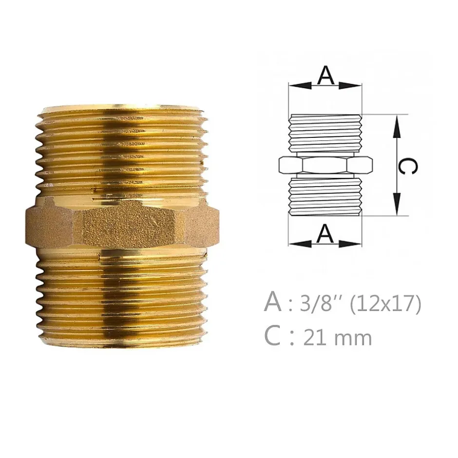 Mamelon laiton égal mâle mâle à visser Vendu à l’unité ou en lot de 5 et 10 pièces. Différents filetages disponibles : 3/8″, 1/2″, 3/4″, 1″, 5/4″. CARACTÉRISTIQUES : Mamelon égal en laiton raccordement mâle mâle à visser. Utilisé pour les travaux de plomberie, sanitaire et chauffage central. Différents filetages à disposition. À NOTER : pas de livraison en Corse ou sur les îles.